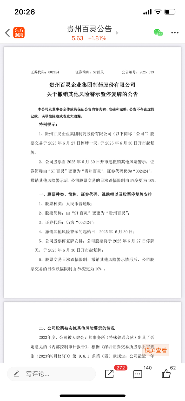 $贵州百灵(SZ002424)$ 一天到晚瞎搞,6月份刚去掉ST,这才几个月又ST,把投资者当猴耍。