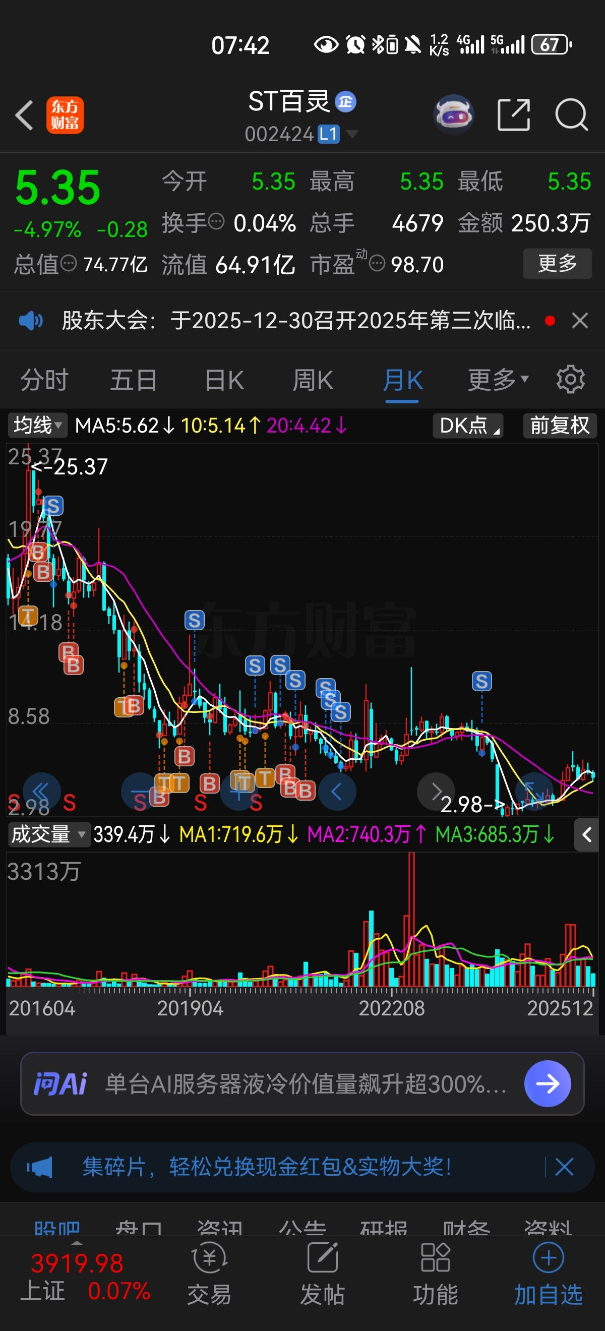 $ST百灵(SZ002424)$ 这个贵州百灵咋回事儿?我从15年底开始买,跌了9年,加了9年仓,折磨了我9年,都没见它涨过,最终在去年年初的时候受不了卖了,现在为啥还在跌?