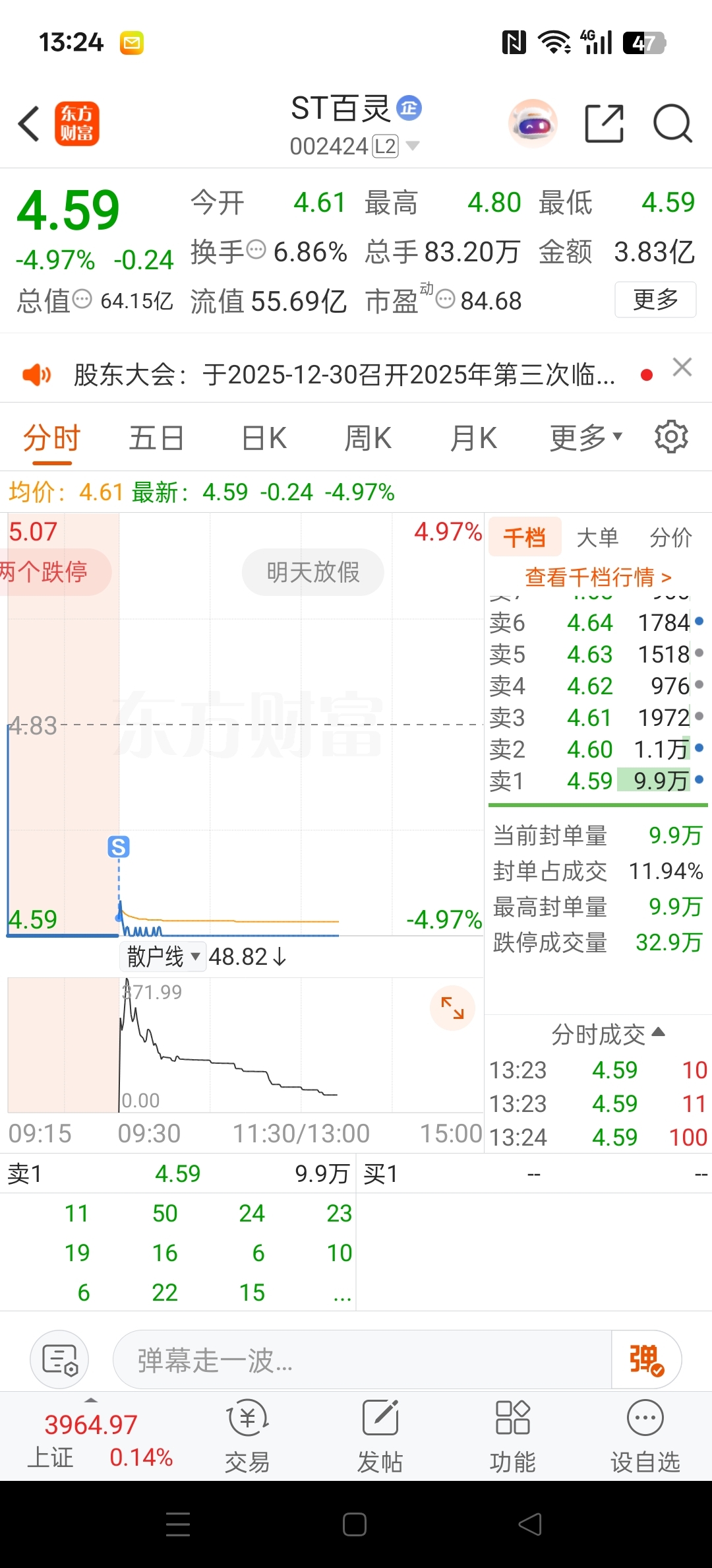 $ST百灵(SZ002424)$ 早上走了一半,然后留一半在里面不管了,就赌百灵不退市,只要不退市这就是底了,而且后续想象空间很大。退市的话那几万块就送你了,如果能退市索赔说不定也还能回一点不亏。
