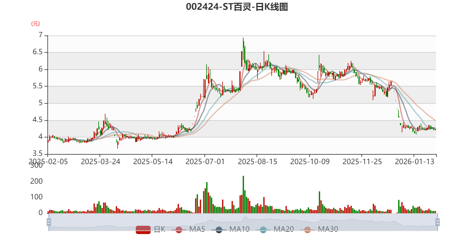 中证智能财讯 ST百灵(002424)1月30日晚间披露2025年度业绩预告,预计2025年营业收入同比下降20%;归母净利润亏损6000万元至9000万元,上年同期盈利3362.19万元;扣非净利润亏损1.02亿元至1.32亿元,上年同期亏损8243.52万元;基本每股收益-0.04元/股至-0.07元/股。以最新收盘价计算,市净率(LF)约1.81倍,市销率(TTM)约1.88倍。