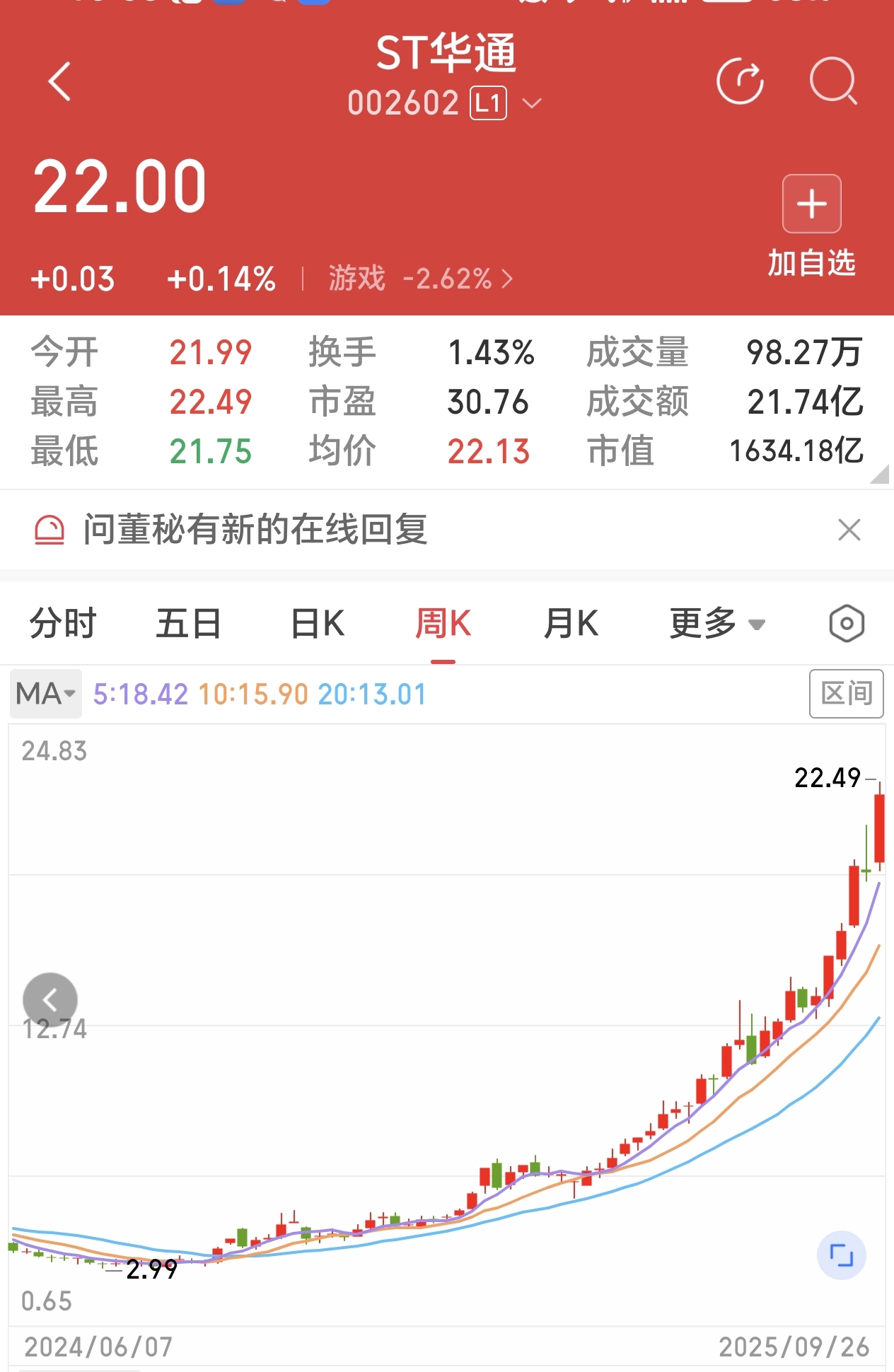 网游股ST华通3元涨到22元涨了7倍,申请摘帽了。
