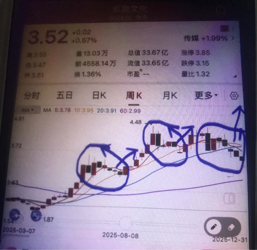 $凯撒文化(SZ002425)$ 周k,结合1月凯文新游戏上线,想3.33以下抄何总底的估计要失望了