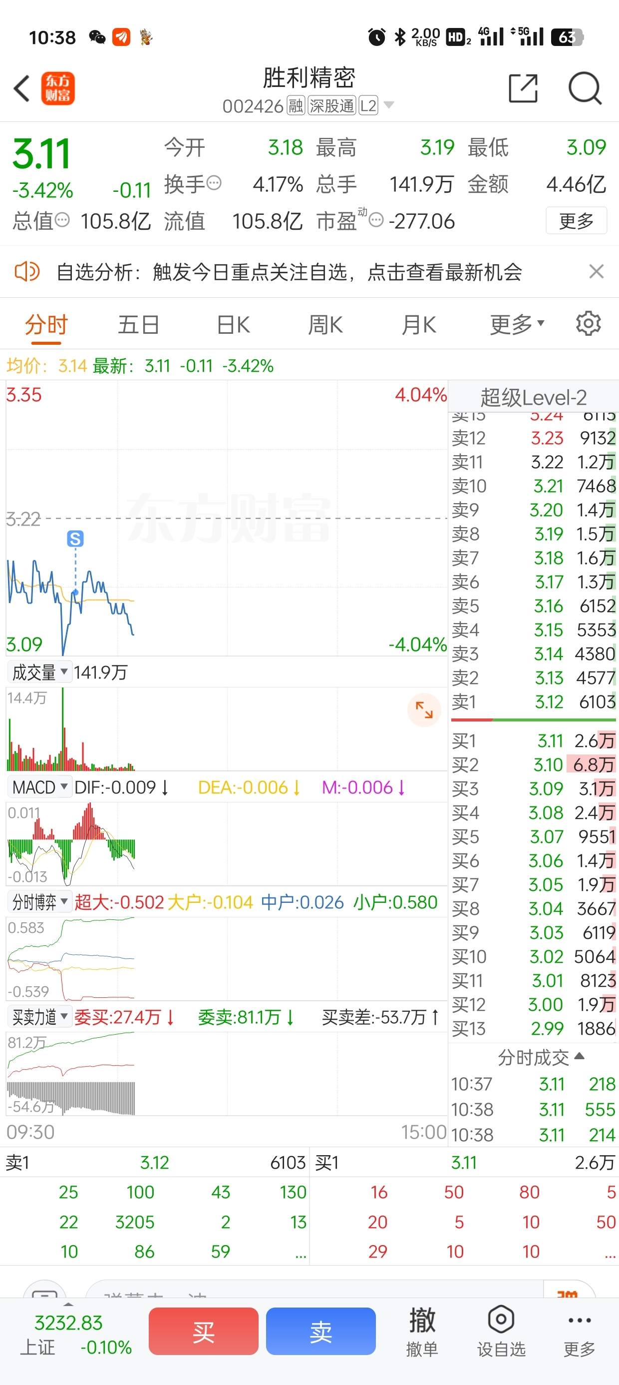 $胜利精密(SZ002426)$ 昨天321,今天316出,认赔了