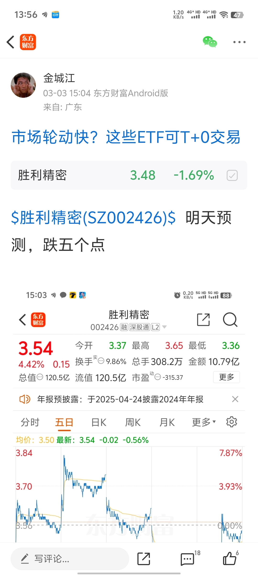 $胜利精密(SZ002426)$ 预测失败,预测跌五个点没跌过,站不上五日线目前不理想,说它要跌还一堆人来骂我,我也是进了仓位的,我也想让它涨可它不理想