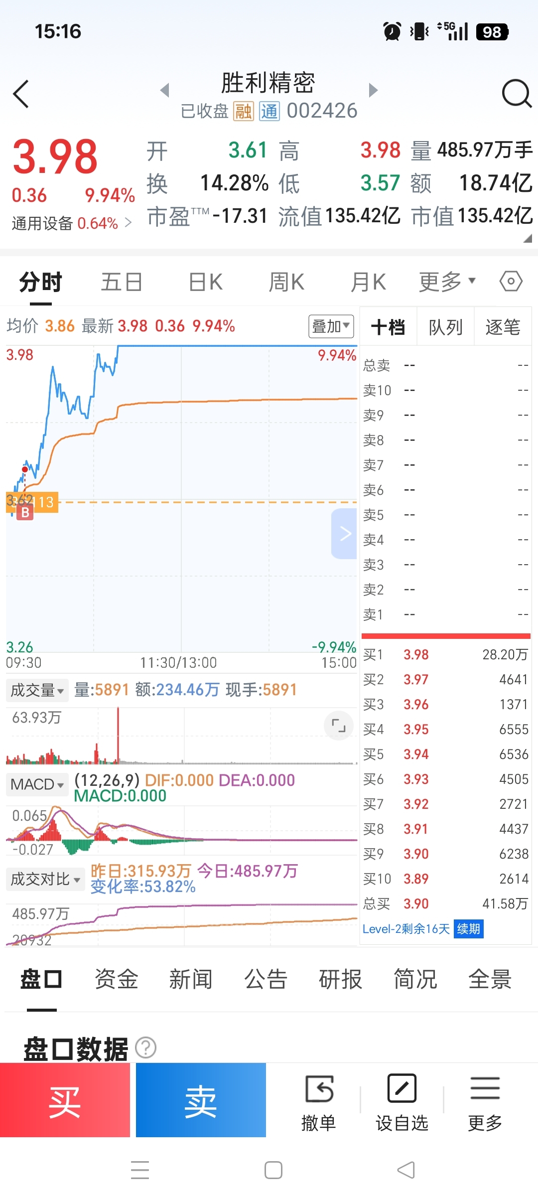 $胜利精密(SZ002426)$ #炒股日记# 前天进了四分之一仓,今天早上追高3.71加了四分之一仓,还有半仓在春兴精工,明天计划减仓春兴精工继续补仓胜利精密!
