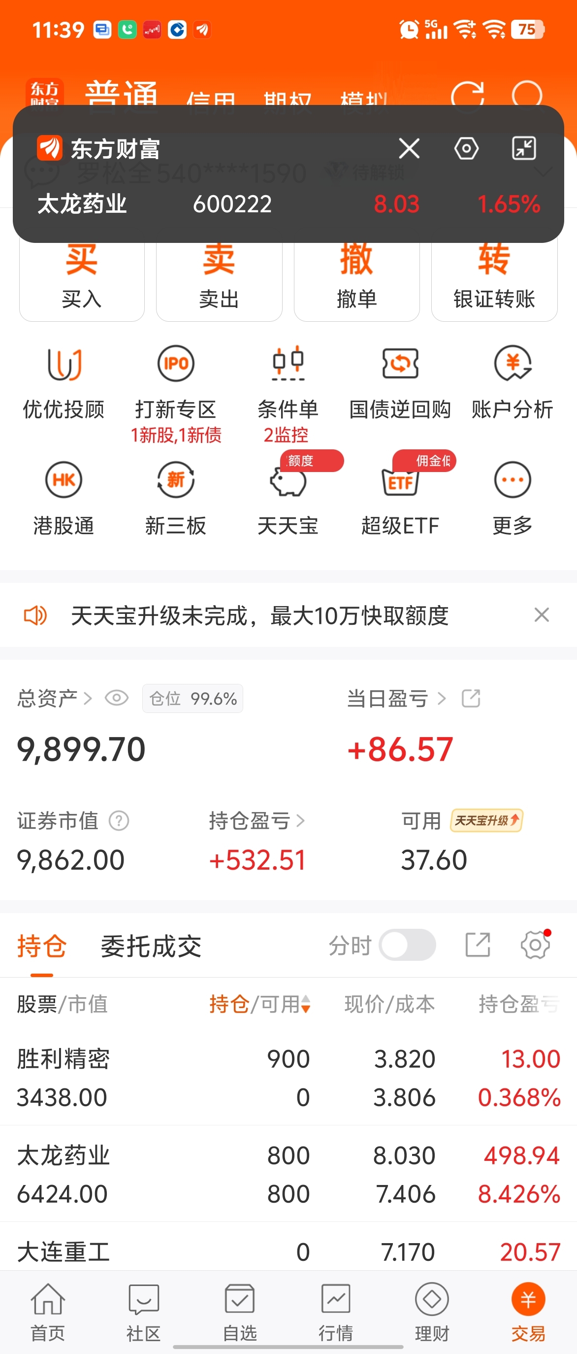 第七,持仓情况:我现在主要实盘操作的一个策略,1/1回测,3个月胜率86%多一点,4倍多收益,前天到今天依次出票太龙药业,众生药业,胜利精密,前天7.4实盘买入太龙,今天3.8买入胜利。众生药业可惜了,昨天到今天差不多20个点。胜利精密短线涨幅巨大,还是亏损股,我也只买了几百股,绝不是推荐你买,只是交流策略用。切记。