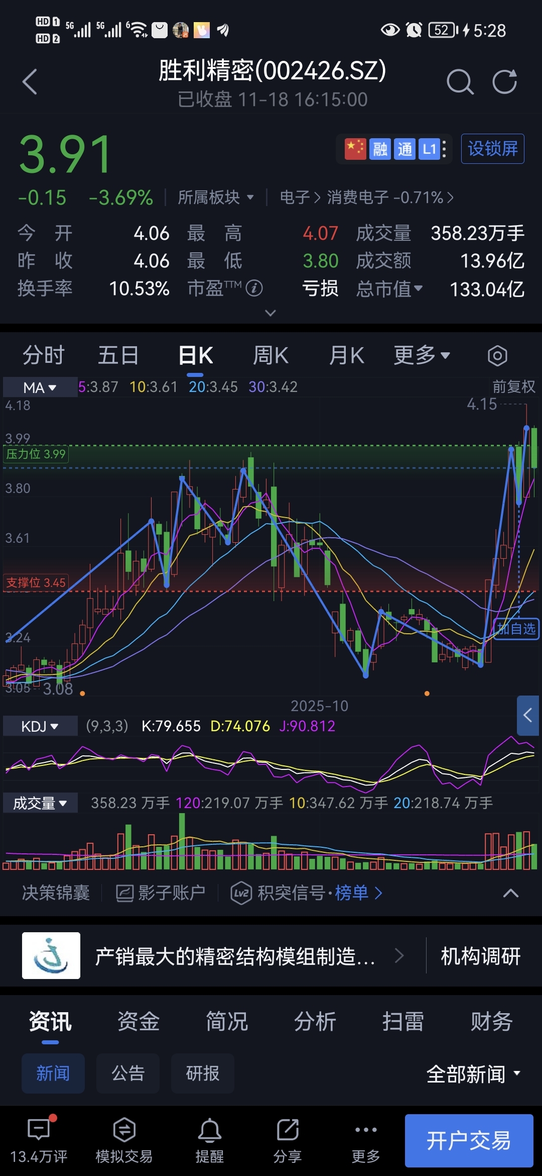 压力位3.99元,支撑位3.45元,平均成本3.72元,不坚定的韭菜走了很多,这