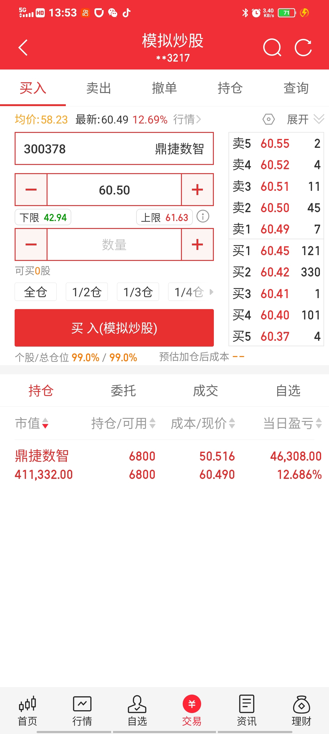 模拟盘上周五卖了胜利精密,换了股,一个交易日赚了6.7万。实盘没敢买