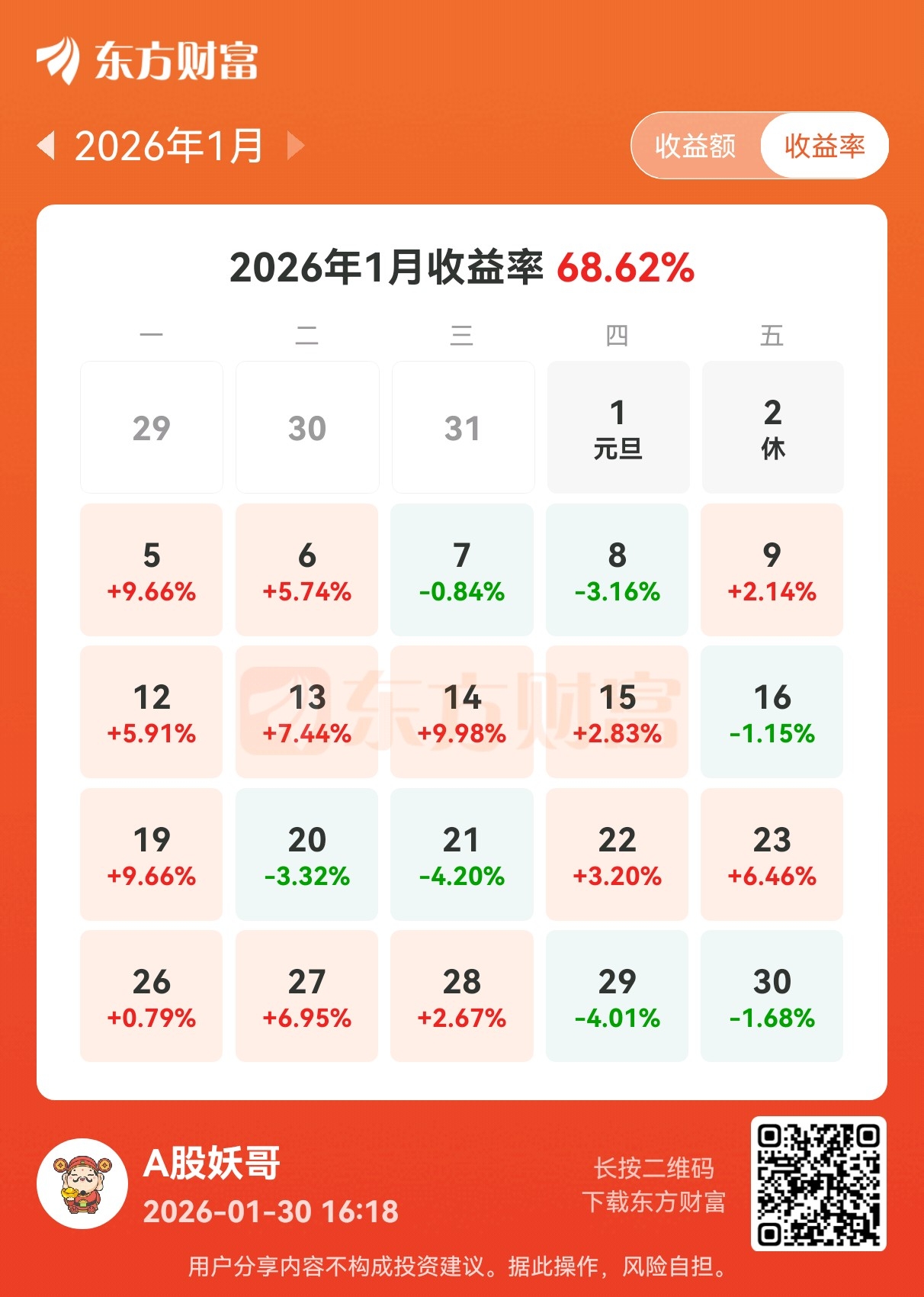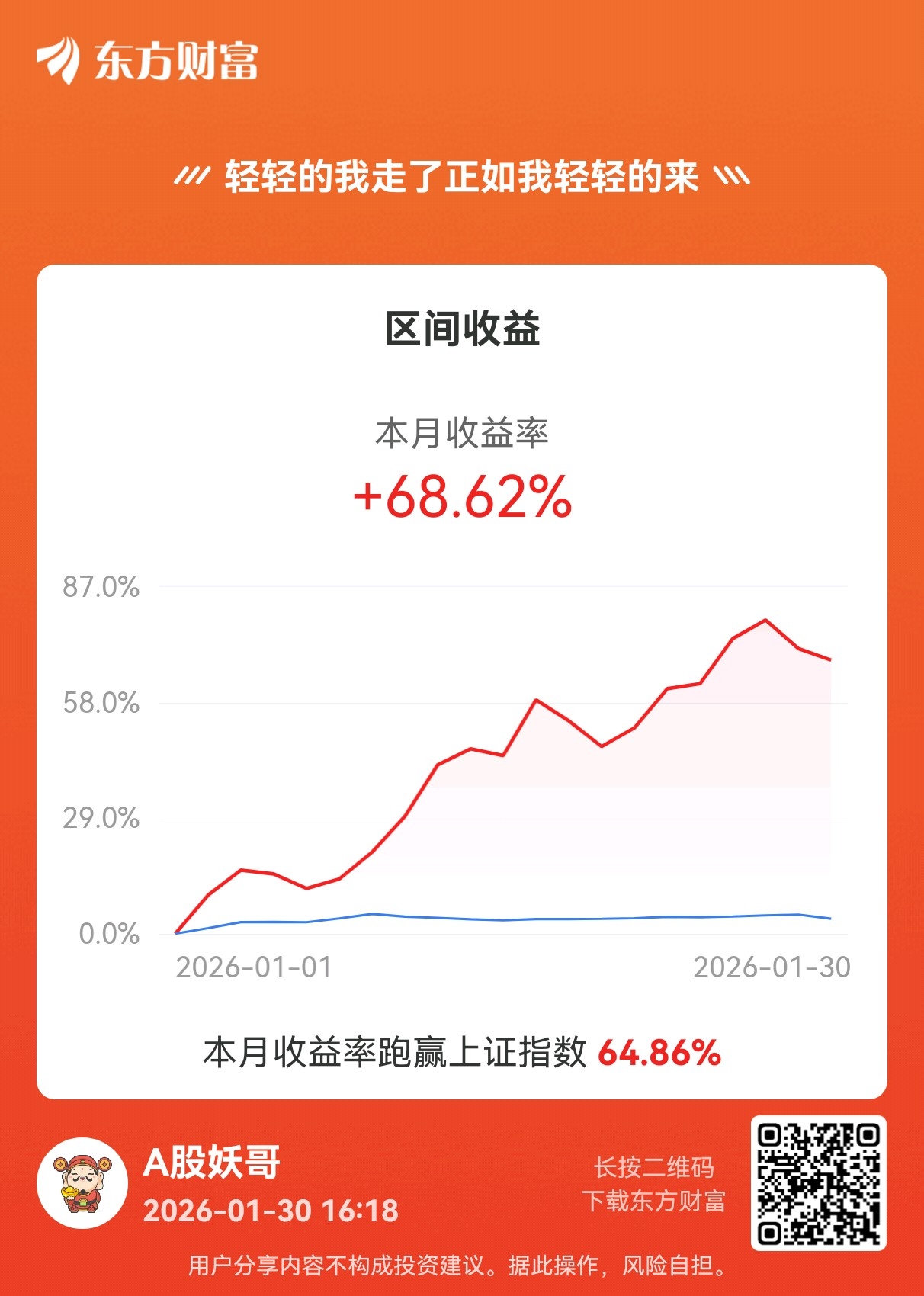 2026年1月超预期收官,单月跑赢去年,今年目标稳扎稳打,跑到80就OK了。有了这个基础,后面11个月就能轻松点了,不求快只求稳,先磨性子吧。。。