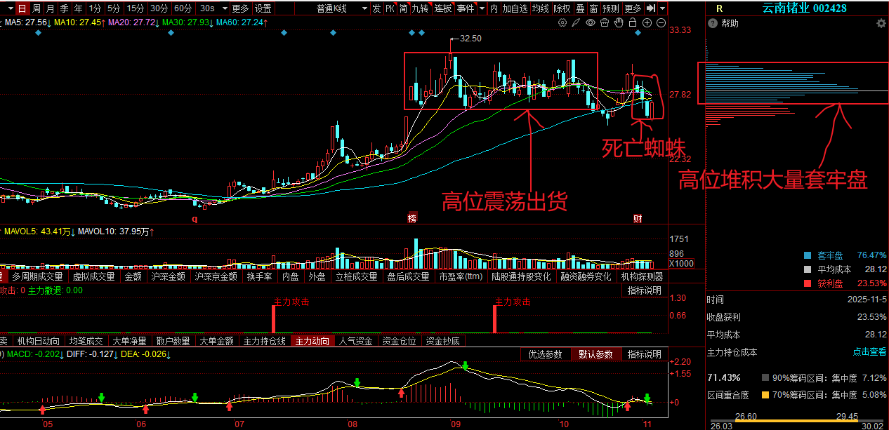 云南锗业股价有效跌穿半年线 下跌趋势明朗 今天的上涨属短期超跌后的缩量反弹 千万不要盲目追涨 要知道主力在18块左右收集筹码后 拉高到30块上方(涨幅近80%)后震荡出货 目前在28块左右的平台留下了大量的套牢盘 均价线在高位形成死亡交叉 俗称死亡黑蜘蛛 死亡黑蜘蛛一般形成后股价向下会有较大的跌幅 套牢的及时止损 获利的及时获利了结落袋为安