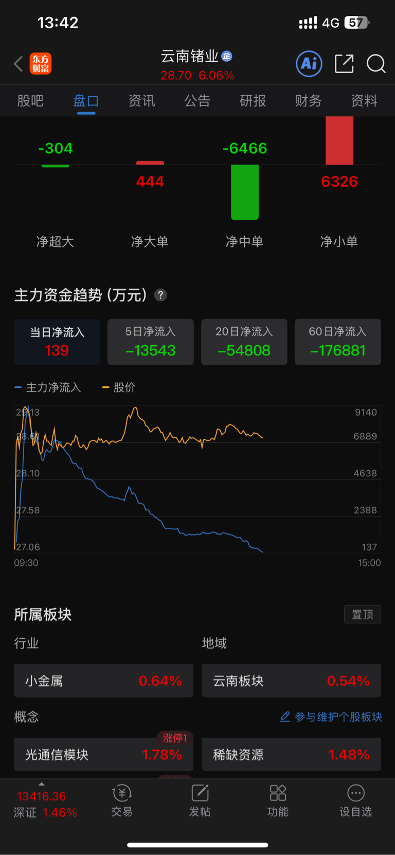 $云南锗业(SZ002428)$ 净流入9000万,现在一百多万,出货啊