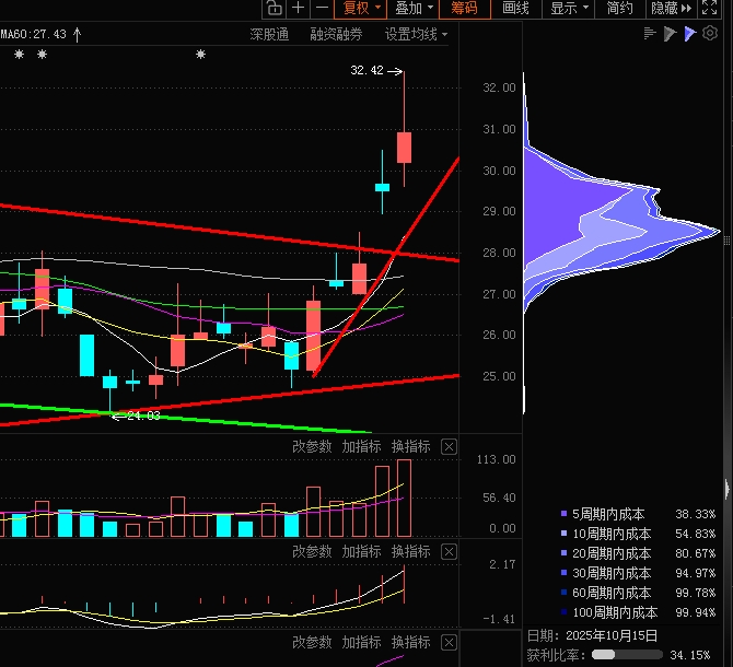 低开在趋势线上,也就是五日线附近29.5左右,如果板块和大盘有量有价,那会低开高走,最高预计可以破前高。如果板块和大盘不及预期,那有可能会跌破上面那根趋势线往下打到下面那根压力线28左右的位置作为突破压力位的日线级别的回踩确认。纯个人猜想,不做各位的投资意见,仅供参考。