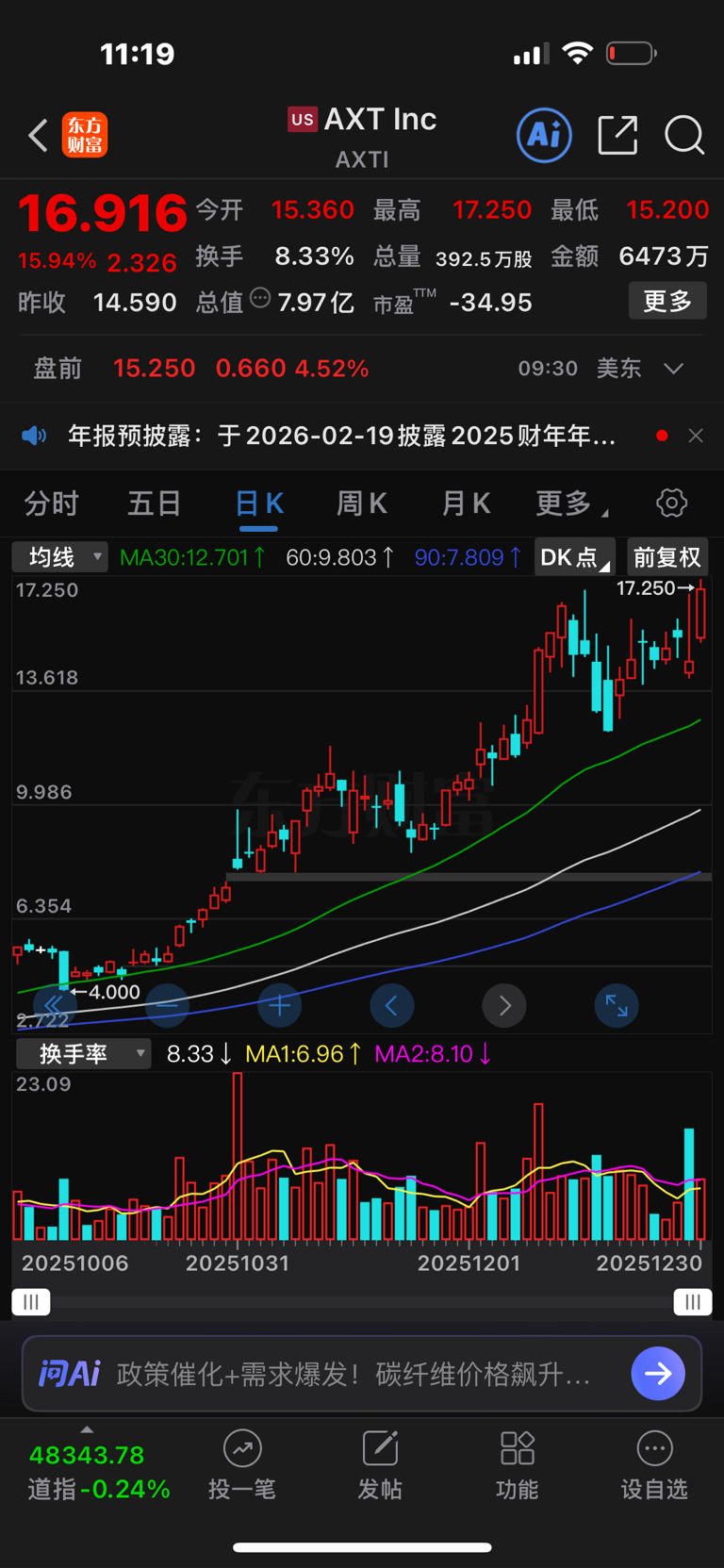 昨天AXT下跌5个点,今天云南锗业跟跌3个点,今晚AXT暴涨16个点,明天云南锗