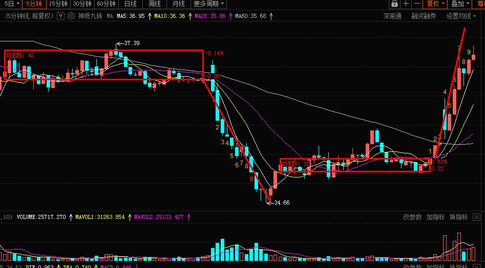 $云南锗业(SZ002428)$ 从五分钟超短期K线图上看,前一波跳水从37.10到34.66,大概跌了2.5块钱左右。那底部突破后至少要涨一样多,从35.5+2.5那就是38。