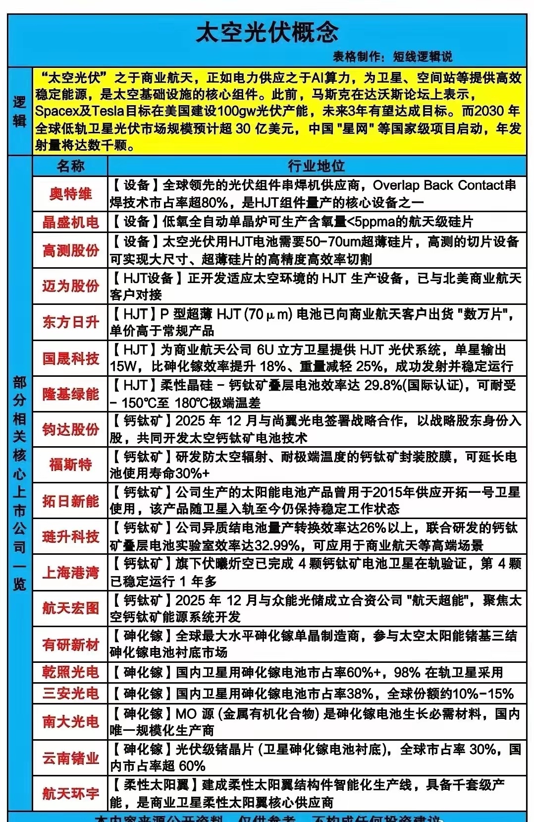 马斯克宣布在美建设100GW光伏产能,中国“星网”工程年发射量将达数千颗。 但当市场目光聚焦于火箭与卫星时,一份详尽的产业链清单却揭露了冰冷现实:板块内涨幅居前的,并非整星制造商,而是那些为卫星提供“超薄HJT电池、钙钛矿材料、航天级硅片”的“卖水人”。 2030年全球低轨卫星光伏市场超30亿美元,而当前在轨卫星98%采用砷化镓电池,技术迭代与国产替代的“戴维斯双击”正在上游悄然发生。