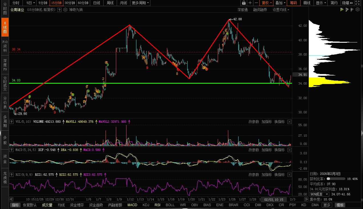 $云南锗业(SZ002428)$ 几天前说过34是这波上涨的颈线位不可轻易破,昨天进行了一次假突破,今天就收回来。也说过这段时间会在34-43之间大幅波段。目前看不会是M头,很可能是W底双底。但要走出w形态,至少要到38左右才能确认,因为这个这波下调的颈线位。