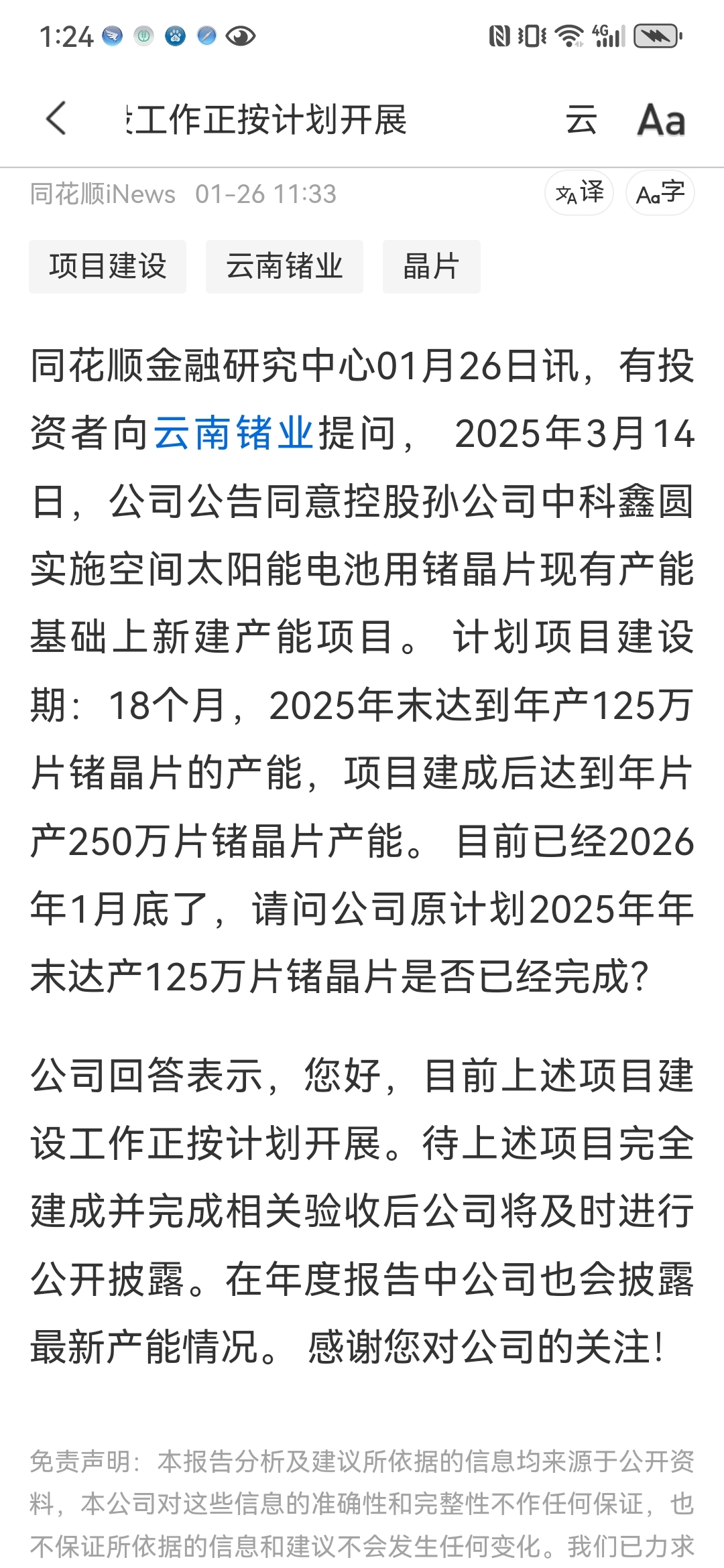 $云南锗业(SZ002428)$ 股民问年产125万片锗晶片25年底完成任务了没有,董秘为何不正面回答,遮遮掩掩,到底是什么意思呢???这样的董秘,能不配位!!!!