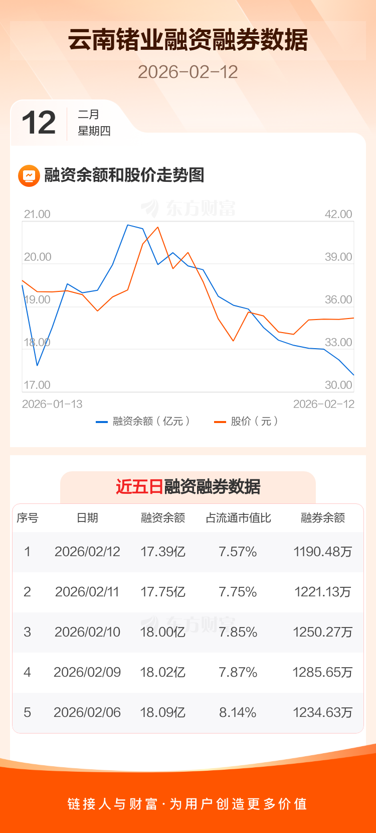 交易所最新数据显示,云南锗业于2026年2月12日获融资买入1.03亿元,融资偿还1.39亿元,当日融资净偿还3595.61万元。目前,该股融资余额17.39亿,占流通市值比例为7.57%。