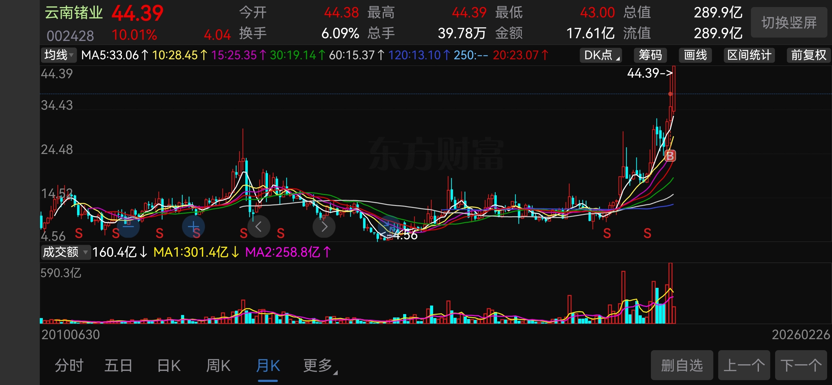$云南锗业(SZ002428)$ 习惯性打开月线想分析下这波的顶在哪,原来创新高了,没历史参考了,那就让它飘呗,飘到啥时心里慌了凭感觉抛