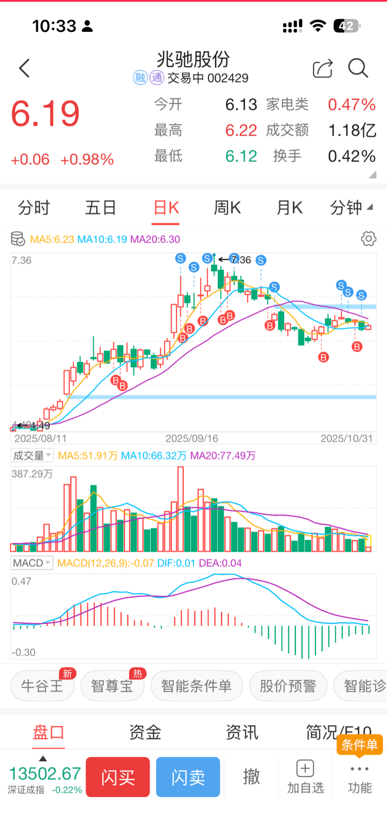$兆驰股份(SZ002429)$ 进出都不知道多少次了,10万的本这个股就5000多盈利,但今天我半仓又杀回来了,奔个10吧