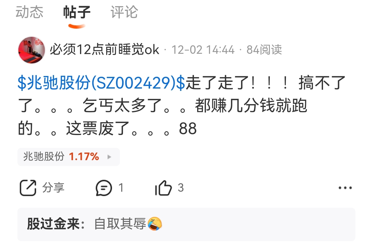 $兆驰股份(SZ002429)$ 12月2日这位叫花子说清仓,12月3日最高冲到6.95我说快涨停有问题吗??哈哈哈哈,他今天又说清仓了,我说太好了,明天能破7了,哈哈哈哈,有什么问题吗