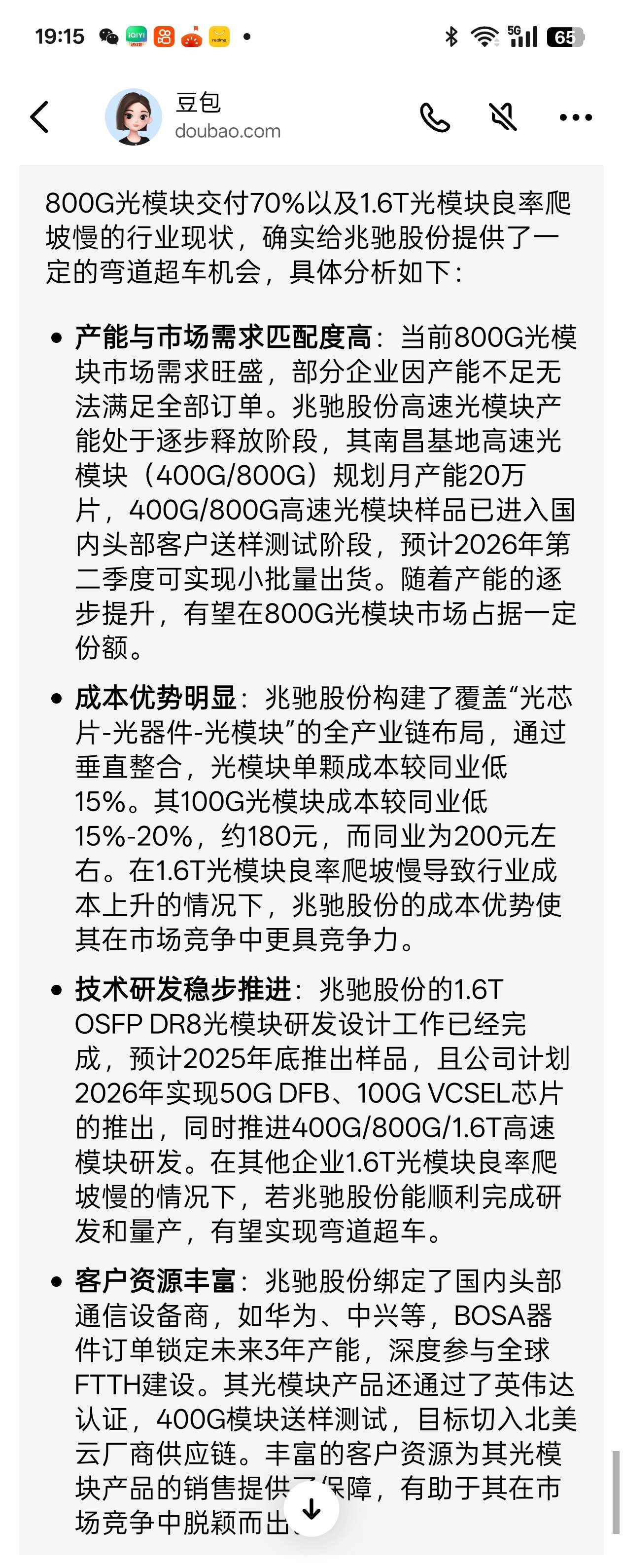 $兆驰股份(SZ002429)$ 兆驰股份进入光模块行业比较晚,但是兆驰股份是一个踏踏实实干企业,从不好高骛远,从低端光模块做起,曾经被股民“嘲笑”产品拿不出手。好在老天有眼,给兆驰股份提供一个后来者居上,弯道超车机会。