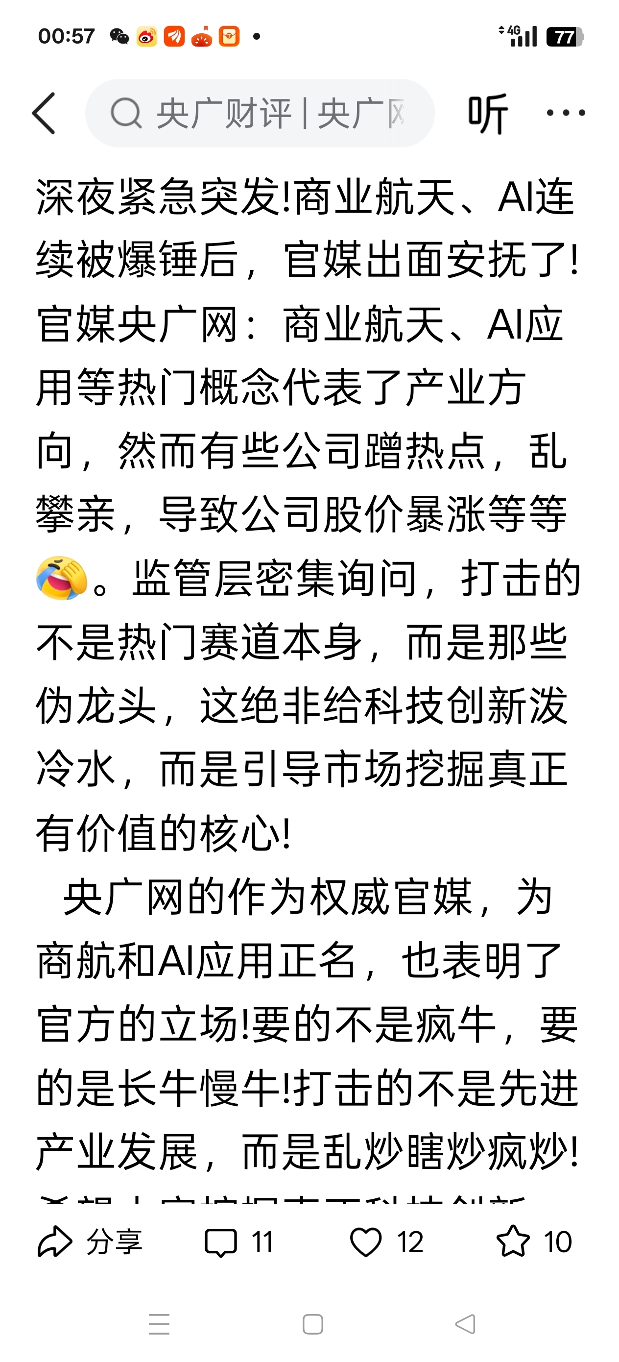 昨天央广网肯定了商业航天,Ai+应用方面方向没有错,就是提醒不要炒作脱离基本面蹭