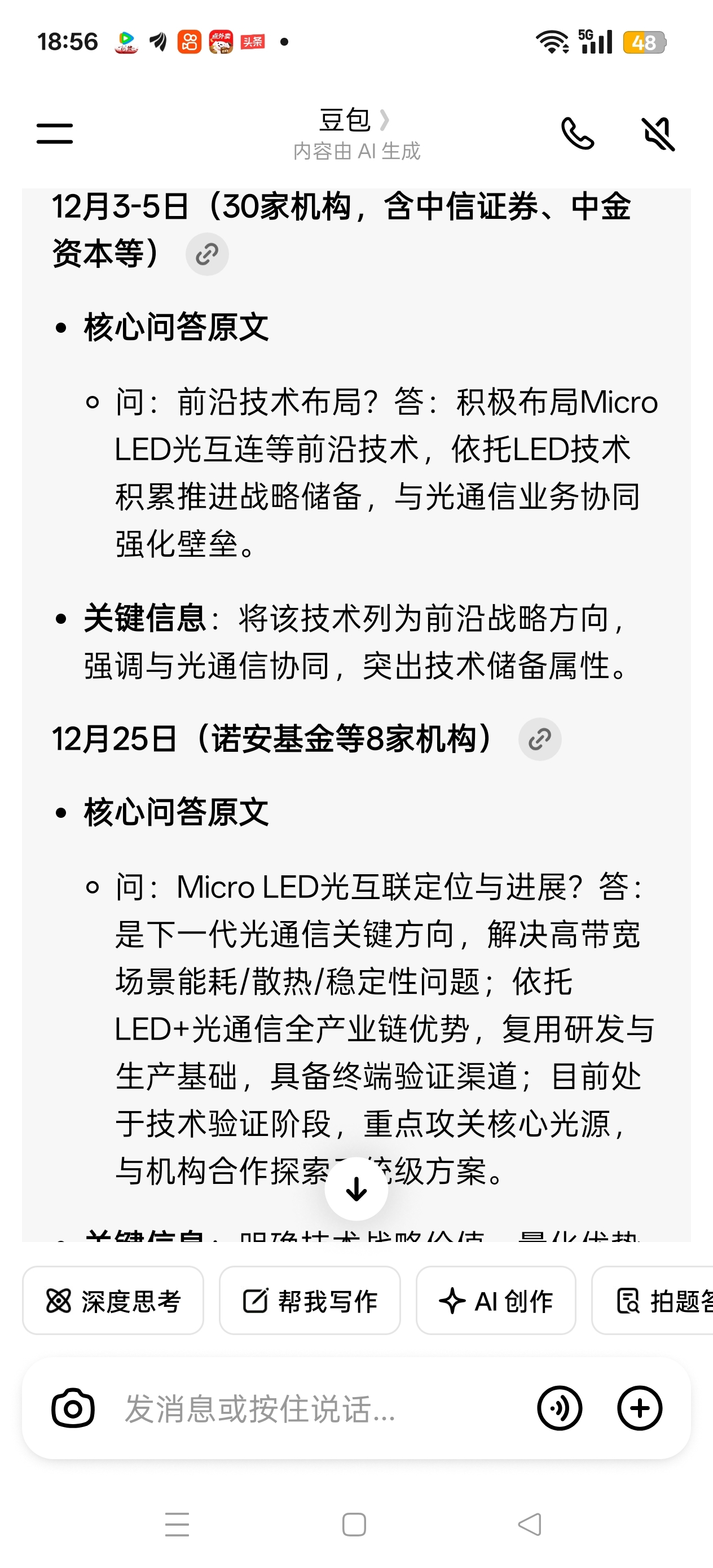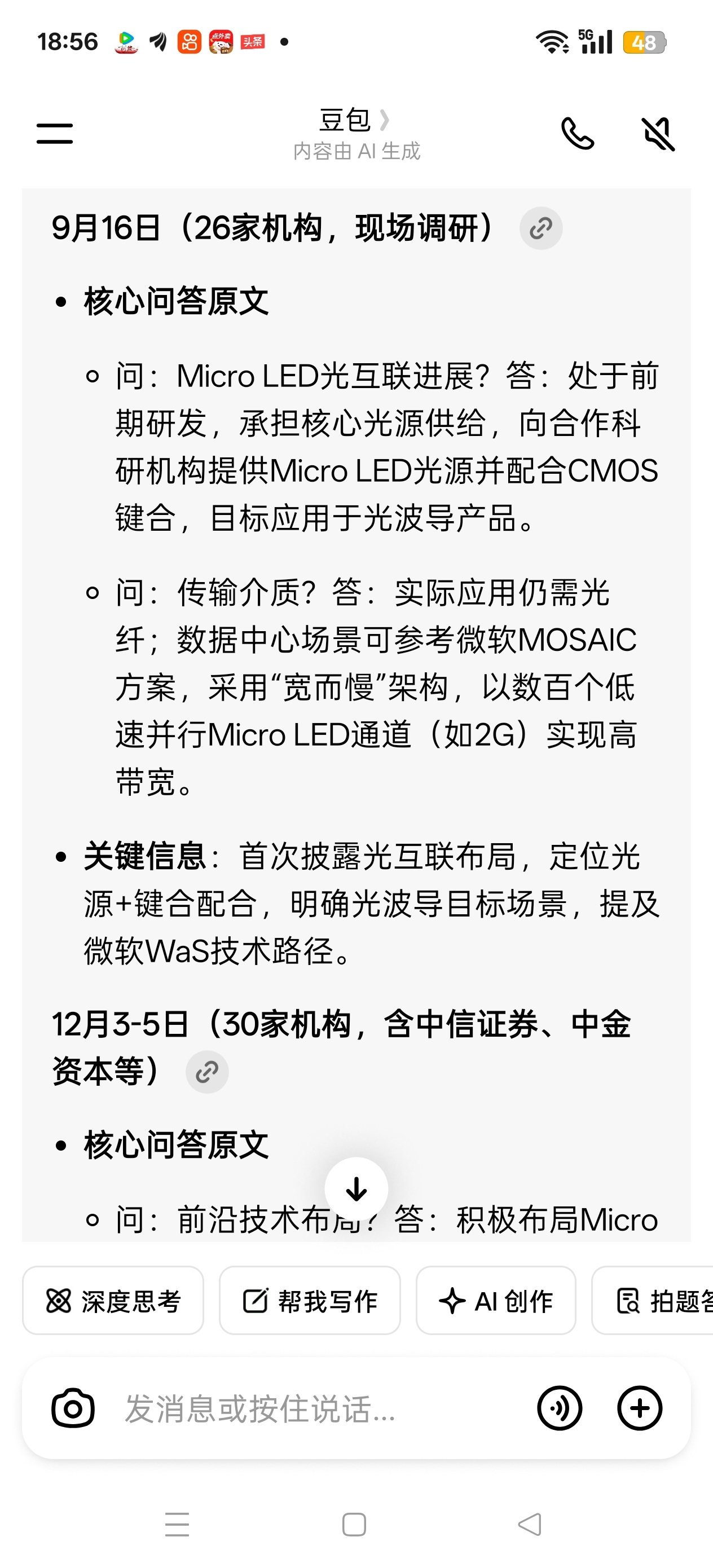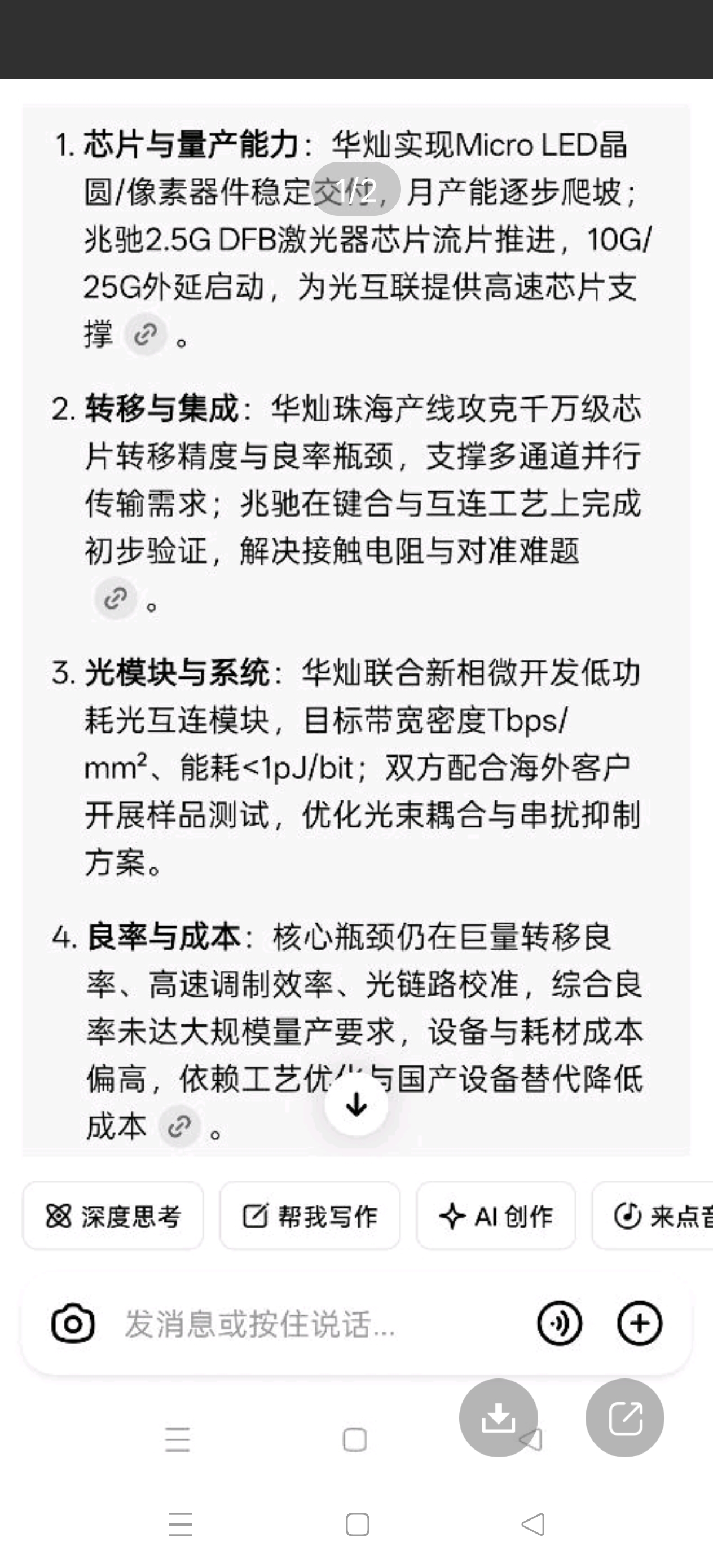 $兆驰股份(SZ002429)$ 今年这次机构去兆驰股份调研再没有问MicroLED光互联问题了,为什么?看看前几次机构提问。现在已经与合作伙伴该送样测试,验证的都紧锣密鼓的进行中,再解决一些瓶颈,相信离官宣不会太远了,如果能够提高产品良率,能够降低成本,能够适配方面通用,那么从小批量试产到正式商业落地就快了。