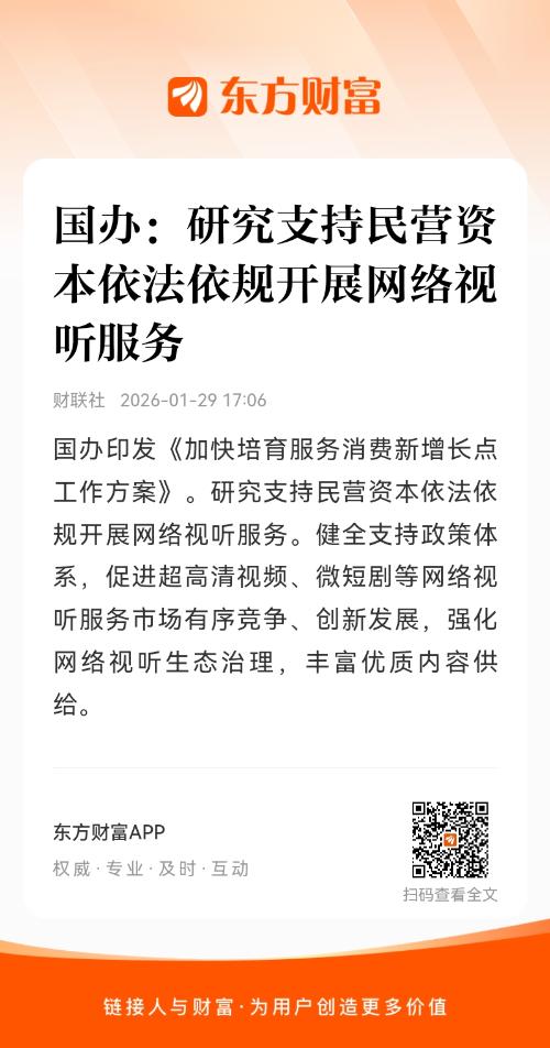 国办印发《加快培育服务消费新增长点工作方案》。研究支持民营资本依法依规开展网络视听服务。健全支持政策体系,促进超高清视频、微短剧等网络视听服务市场有序竞争、创新发展,强化网络视听生态治理,丰富优质内容供给。支持超高清关键核心技术攻关和产业化应用、制播能力提升、网络升级改造及终端更新升级,推进超高清端到端全链条贯通。