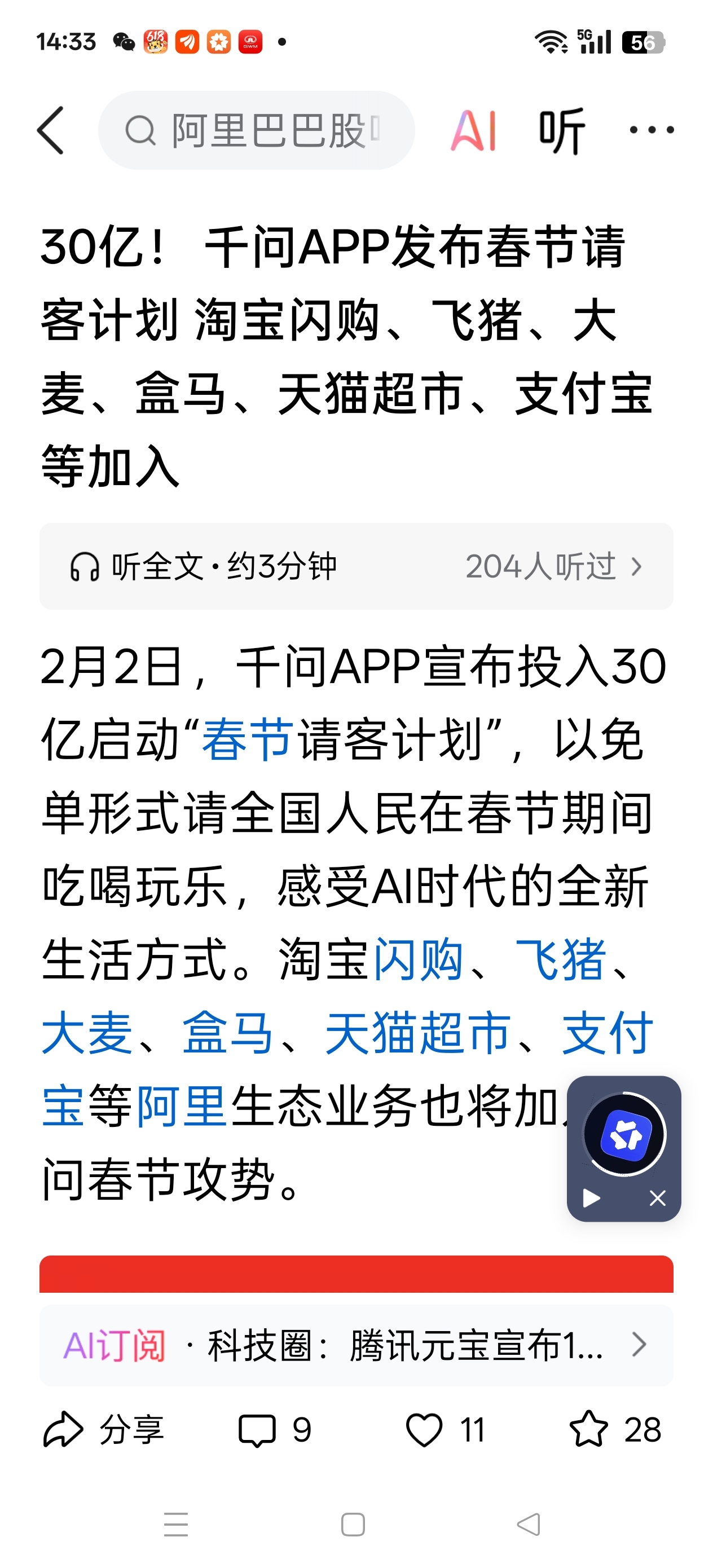 $兆驰股份(SZ002429)$ 兆驰股份旗下北京风行抱紧千问这条大腿,春节发30亿红包,够豪够横。