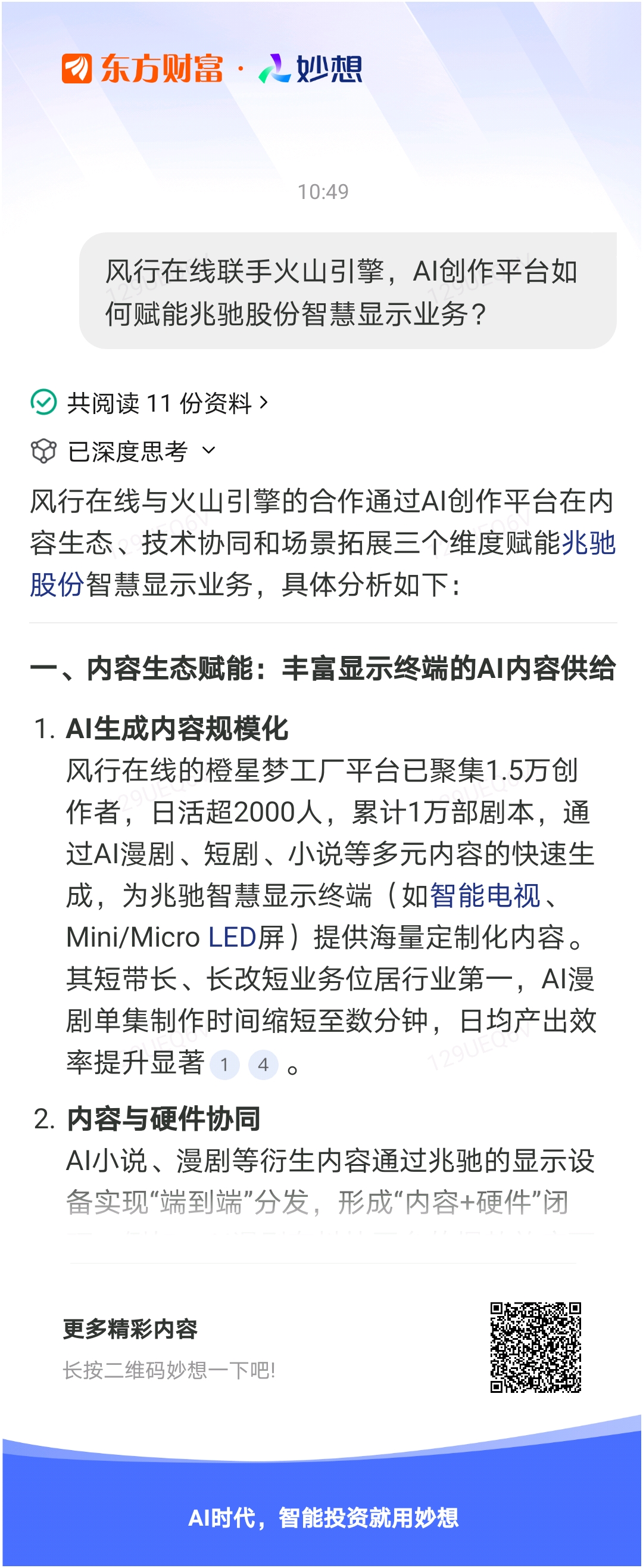 #@妙想,你怎么看?# @兆驰股份 妙想一下:风行在线联手火山引擎,AI创作平台如何赋能兆驰股份智慧显示业务?