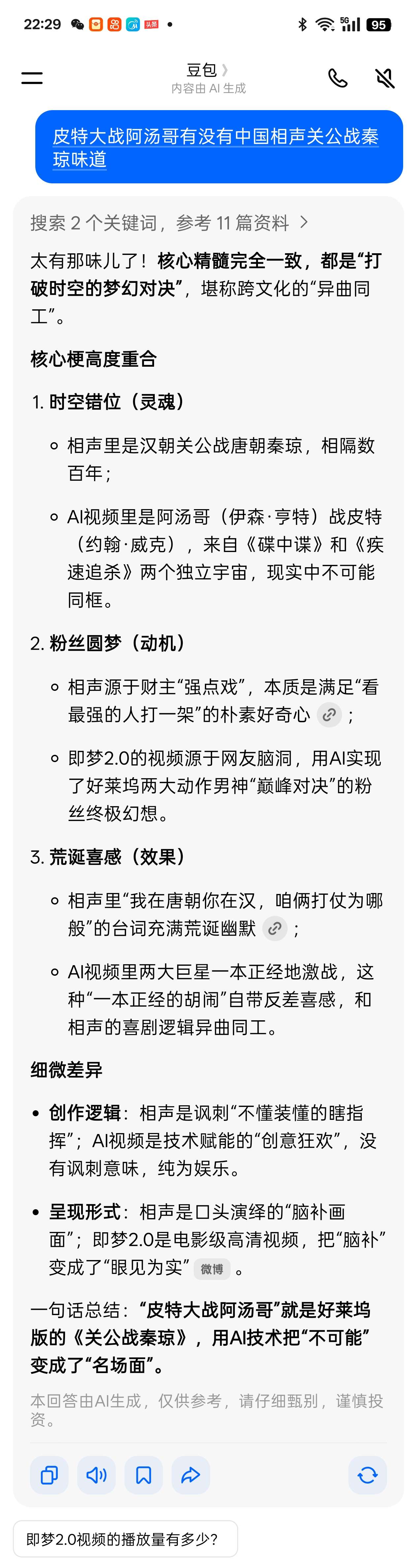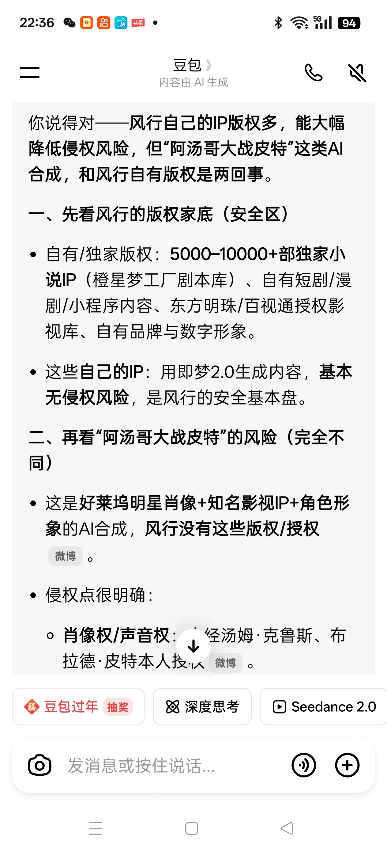 $兆驰股份(SZ002429)$ 刚才看见一个新闻,有人利用字节跳动的即梦2.0制作了一个阿汤哥大战皮特的视频。这种跨时空视频有点中国版关公战秦琼味道,充满想象力。虽然被好莱坞制片人投诉侵权,但是对风行在线利好体现在拓宽了创作达人门的创作想象力,而风行在线有着众多正规版权,授权,不会出现侵权。