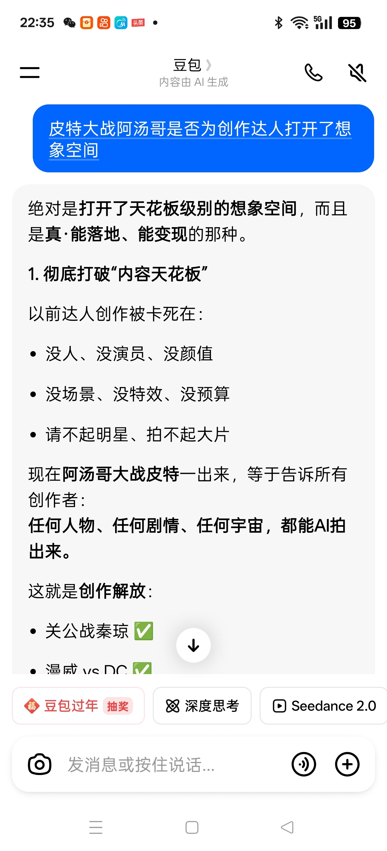 刚才看见一个新闻,有人利用字节跳动的即梦2.0制作了一个阿汤哥大战皮特的视频。这