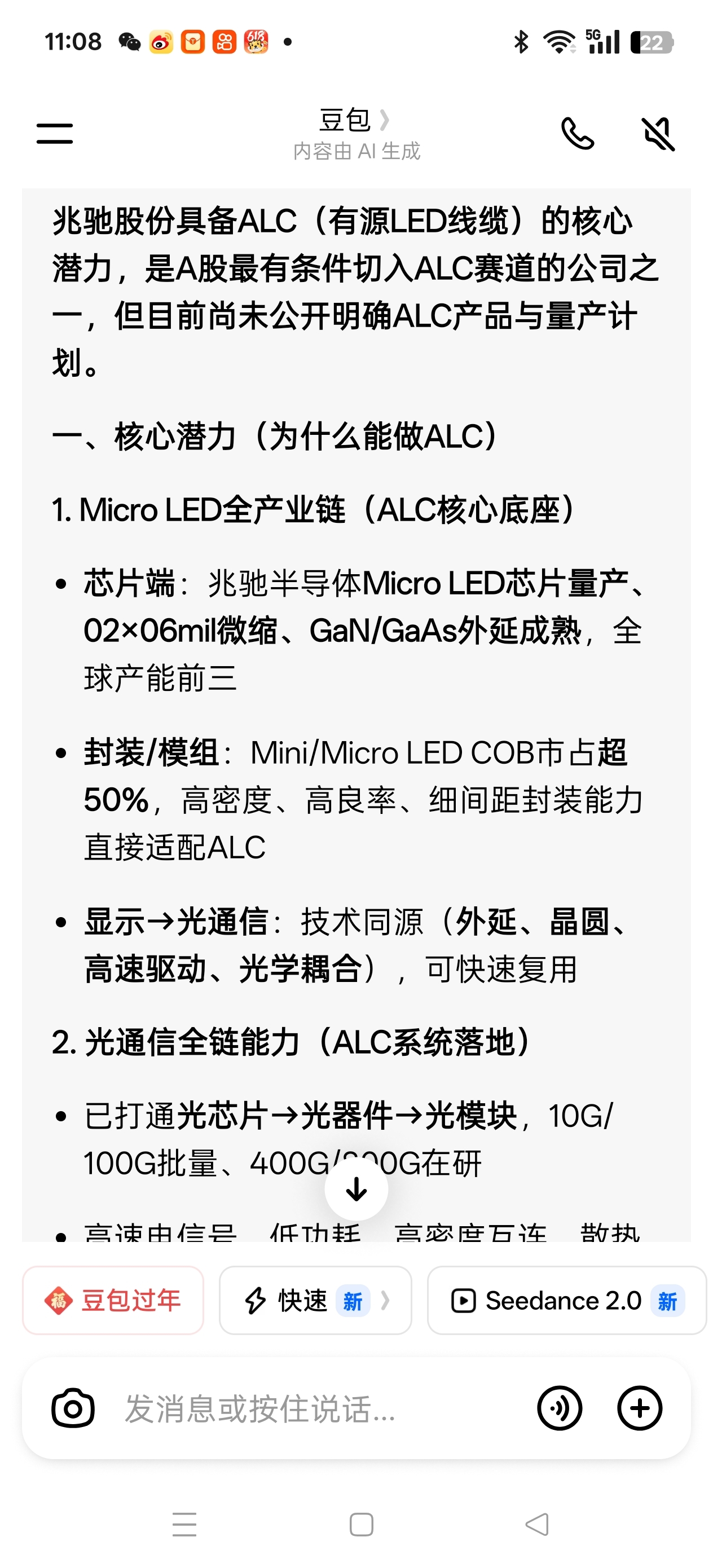 $兆驰股份(SZ002429)$ 在小红书上看了兆驰股份董秘单女士接受证券日报高端采访谈话后,有一种感觉,未来兆驰有可能在自己熟悉优势赛道寻找高利润高附加值产品,最有可能,未来人工智能硬件升级刚需: ALC有源LED线缆行业。