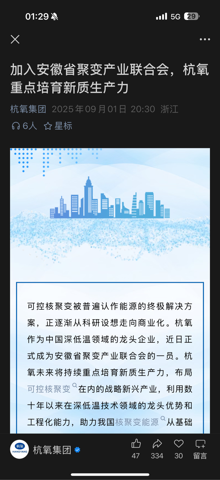 $杭氧股份(SZ002430)$ 未来十年,将是核聚变技术从实验室走向商业化的关键期。杭氧的深度参与,不仅为企业自身开辟了新的增长空间,填补了从实验室研究到工程化应用的关键环节空白,加速了聚变能的商业化进程,更将带动整个高端装备制造产业链升级,为国家抢占终极能源技术制高点、实现能源独立与碳中和目标提供坚实支撑。