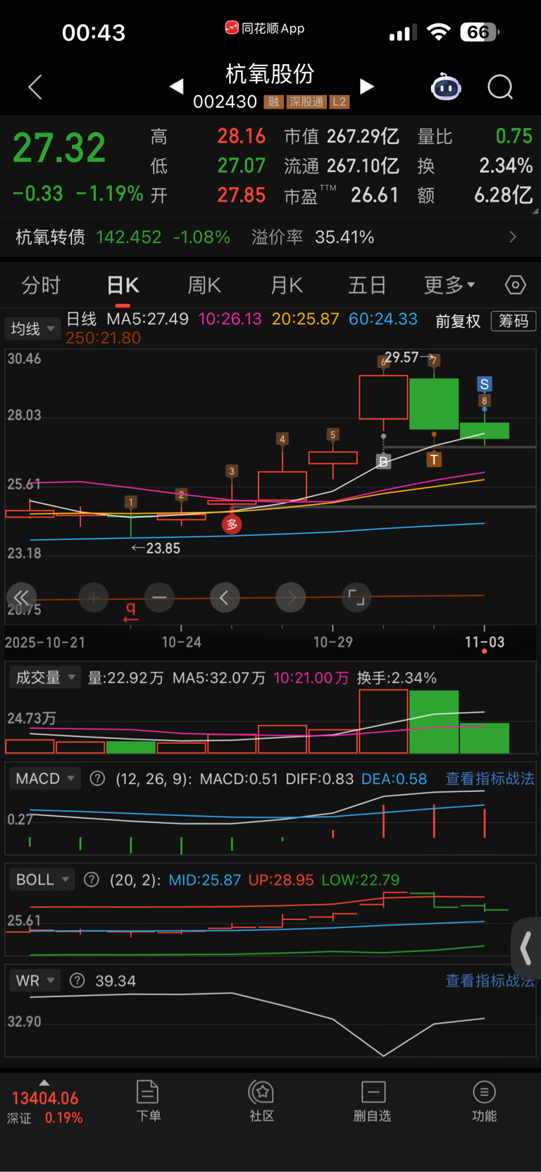 $杭氧股份(SZ002430)$ 第一天涨停第二天竞价不及预期直接按核按钮就出了,因为高开没有快速封板这就是一个要注意的问题二封板了还扯单虽然炸板封板时间不长回风但是成交量过大超过前几日之和,第二天还低开,我去他dy的,韩伟发套直接走人,有利好我也不稀罕。不过尾盘接了点今天最高掉清仓吃了口小小肉