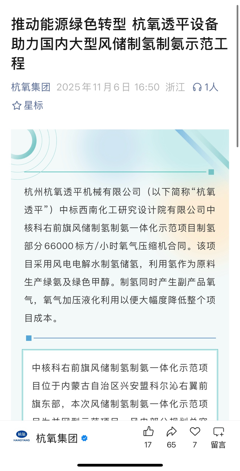 $杭氧股份(SZ002430)$ 杭州杭氧透平机械有限公司(以下简称“杭氧透平”)中标西南化工研究设计院有限公司中核科右前旗风储制氢制氨一体化示范项目制氢部分66000标方/小时氧气压缩机合同。该项目采用风电电解水制氢储氢,利用氢作为原料生产绿氨及绿色甲醇。制氢同时产生副产品氧气,氧气加压液化利用以便大幅度降低整个项目成本。