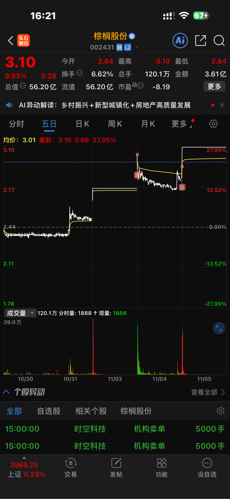 $棕榈股份(SZ002431)$ 昨天早就涨停价买入,因为他是慢慢撤单的我也没在意,结果洗的真深,今日看到弱转强就有点犹豫了,看见是真的就果断跟随