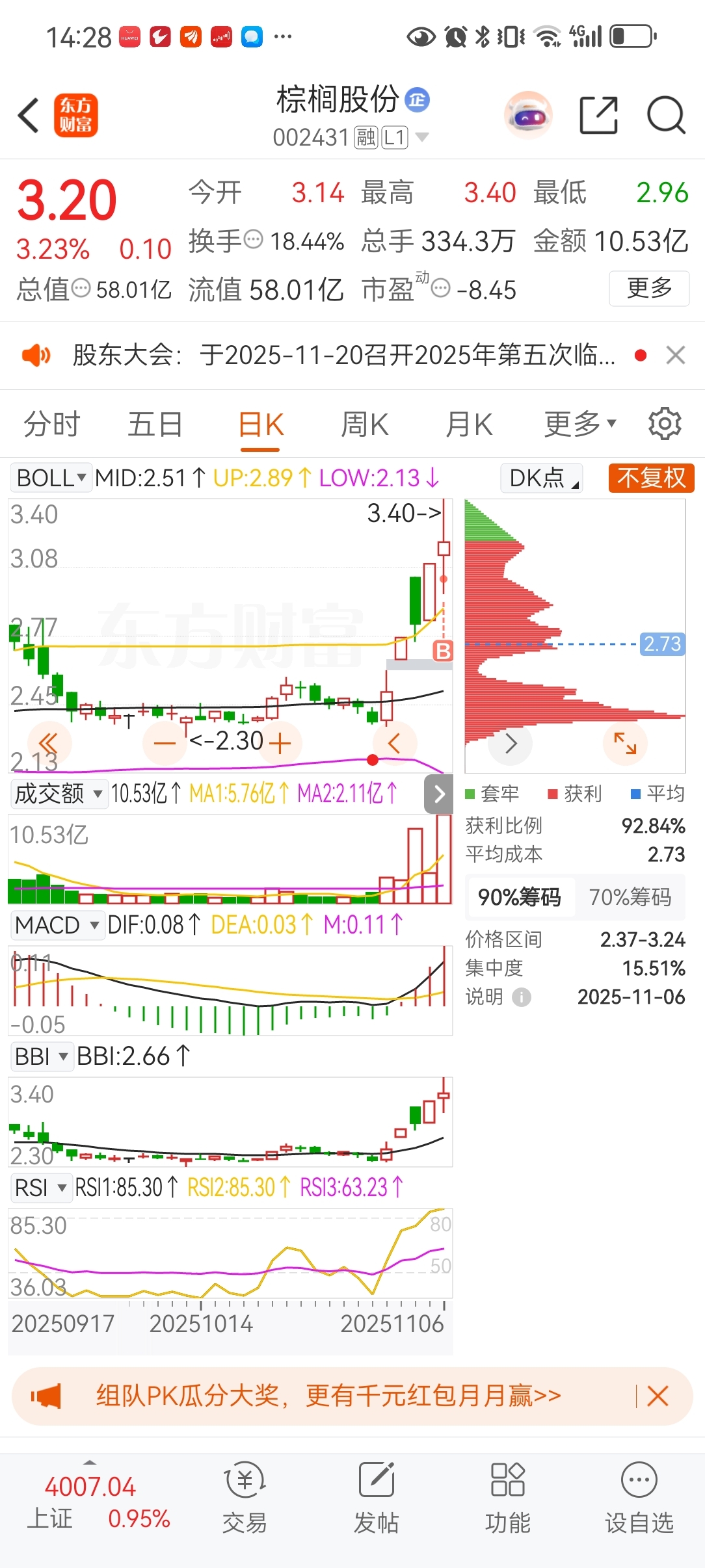 $棕榈股份(SZ002431)$ 今天放量就是个正常分歧,早上冲高差一分钱涨停,估计是下面上来的获利跑了,又从底部拉上来,虽然没有大资金合力,但能拉那么急也不是我们散户能做到的!如果是出货就没必要再拉起来给大家高位跑路了,这行情好的前排买不到那只能做这种咯,既来之,则安之,明天再看吧!