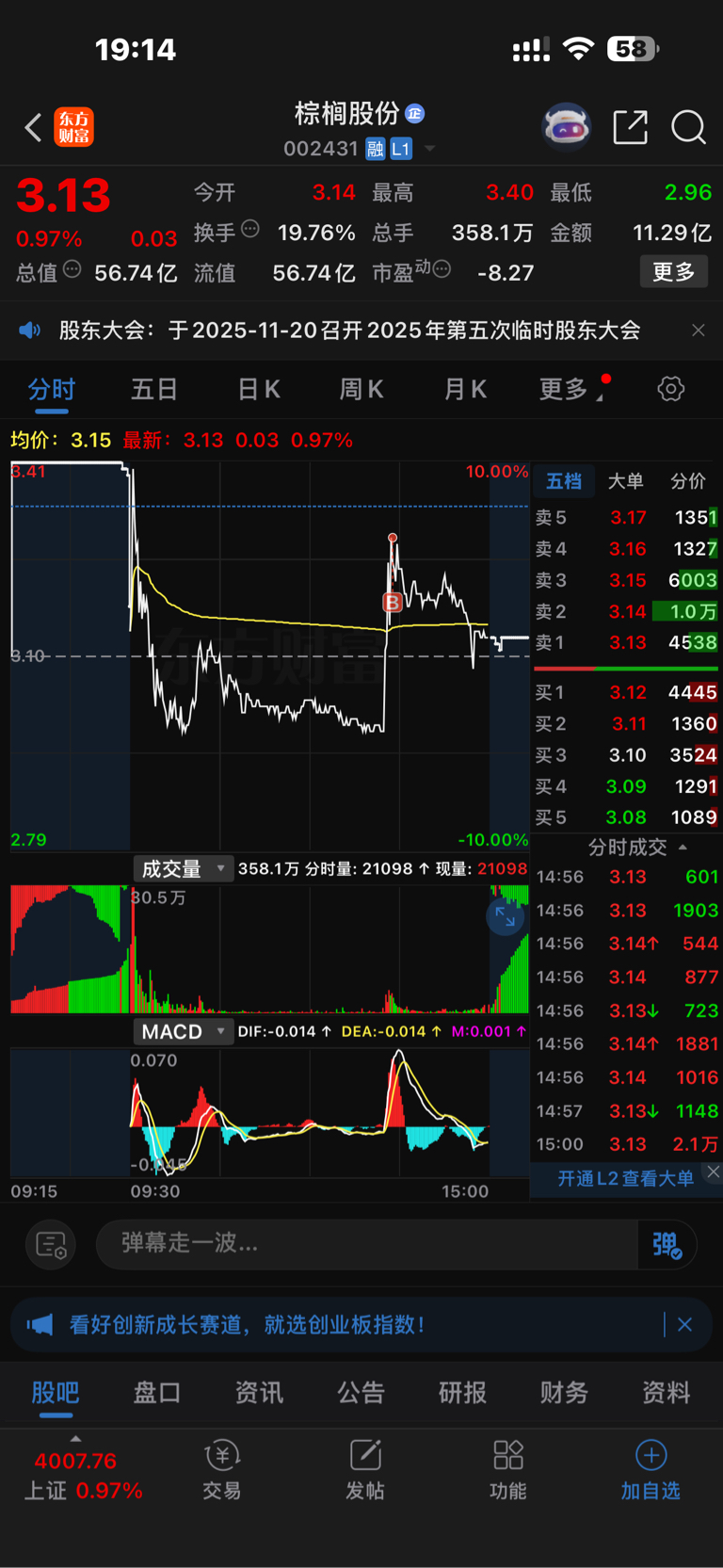$棕榈股份(SZ002431)$ 我是试下是不是买就崩,果然是这样