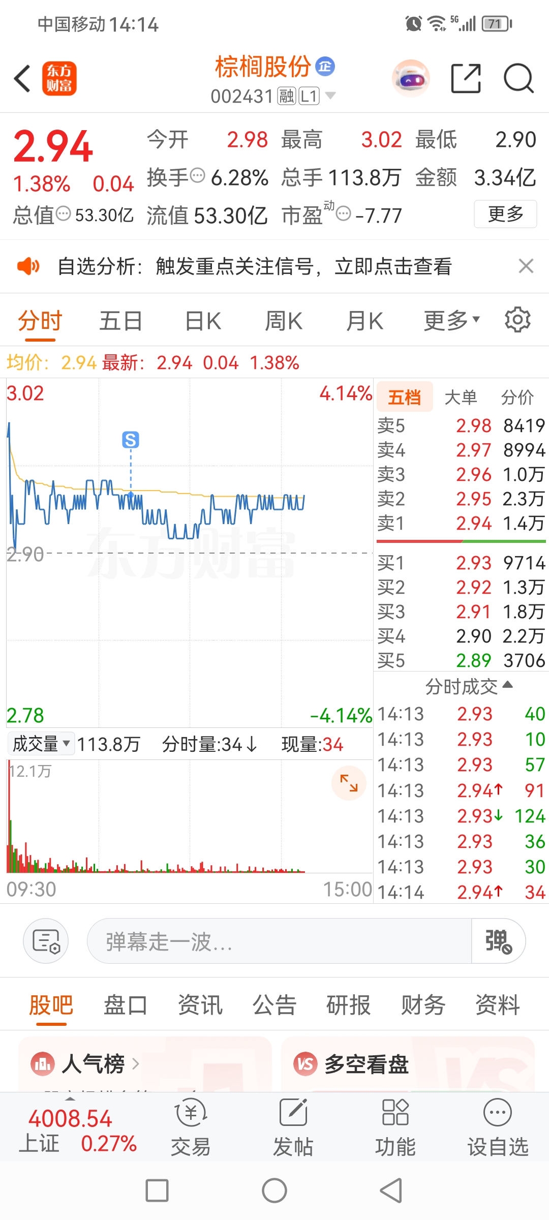 $棕榈股份(SZ002431)$ 亏了12个点走了,太磨叽