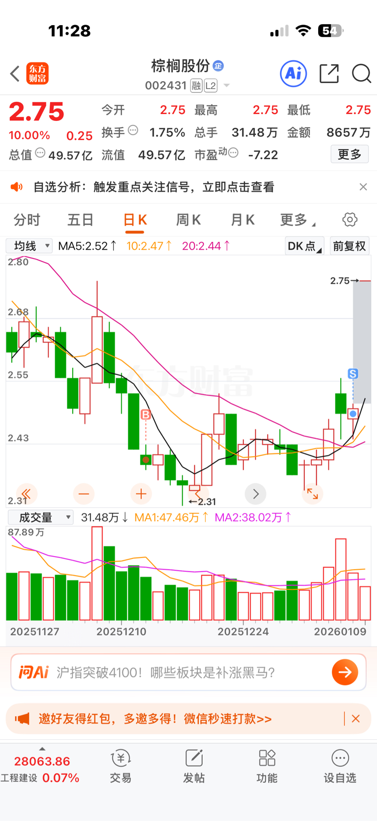 $棕榈股份(SZ002431)$ 差我那三瓜两枣吗