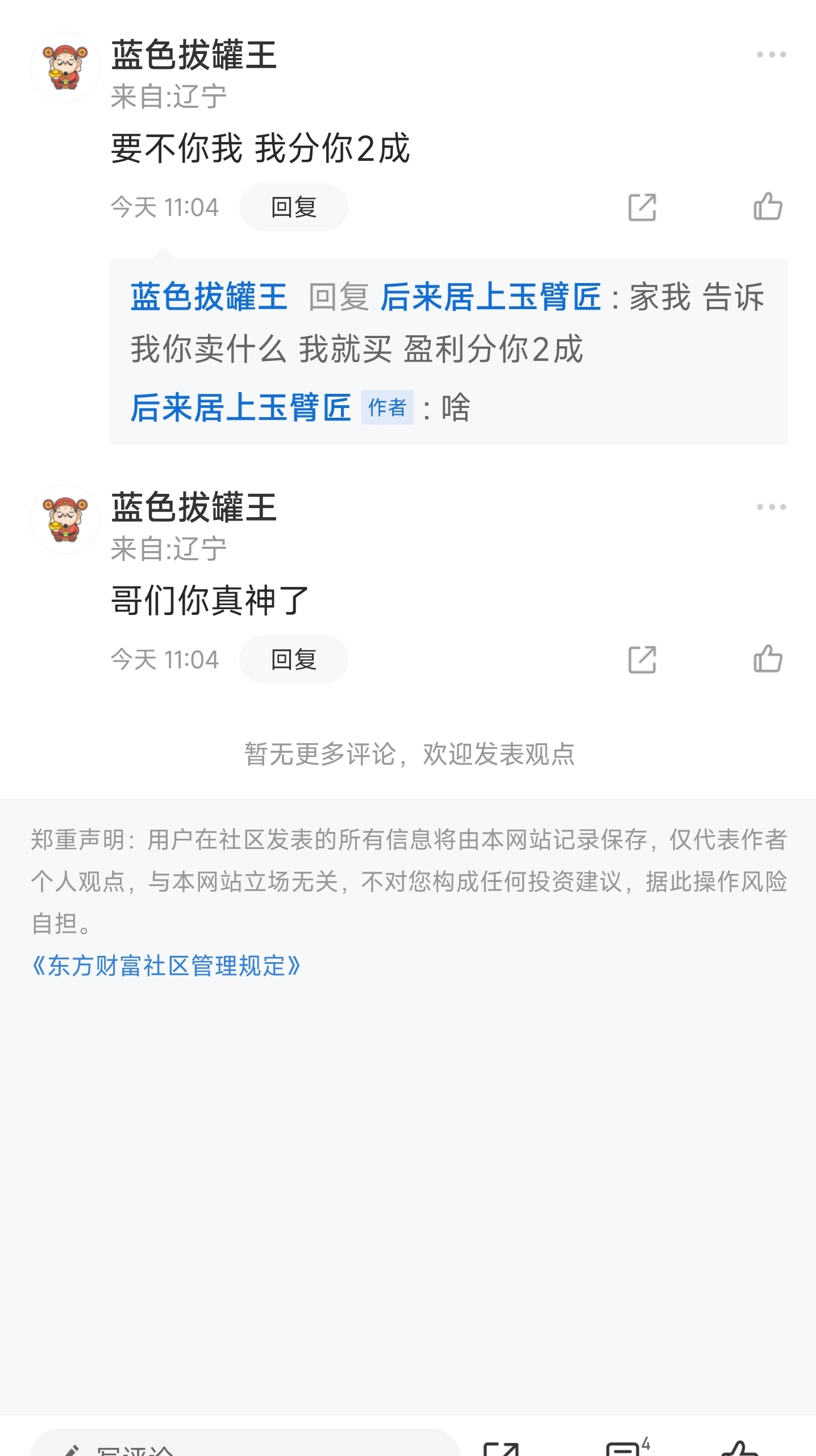 温馨提示: 1.根据《证券法》规定,禁止编造、传播虚假信息或者误导性信息,扰乱证券市场;2.用户在本社区发表的所有资料、言论等仅代表个人观点,与本网站立场无关,不对您构成任何投资建议。用户应基于自己的独立判断,自行决定证券投资并承担相应风险。《东方财富社区管理规定》