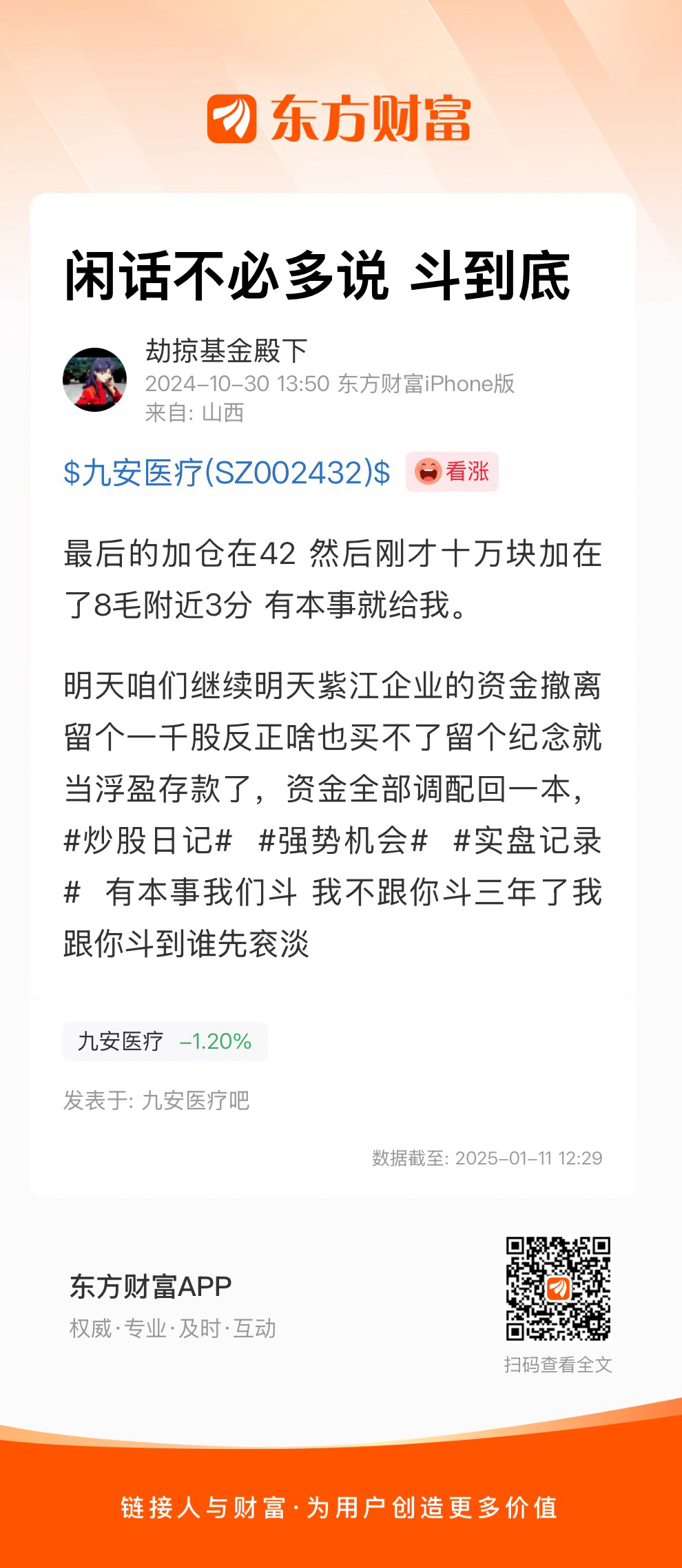 温馨提示: 1.根据《证券法》规定,禁止编造、传播虚假信息或者误导性信息,扰乱证券市场;2.用户在本社区发表的所有资料、言论等仅代表个人观点,与本网站立场无关,不对您构成任何投资建议。用户应基于自己的独立判断,自行决定证券投资并承担相应风险。《东方财富社区管理规定》