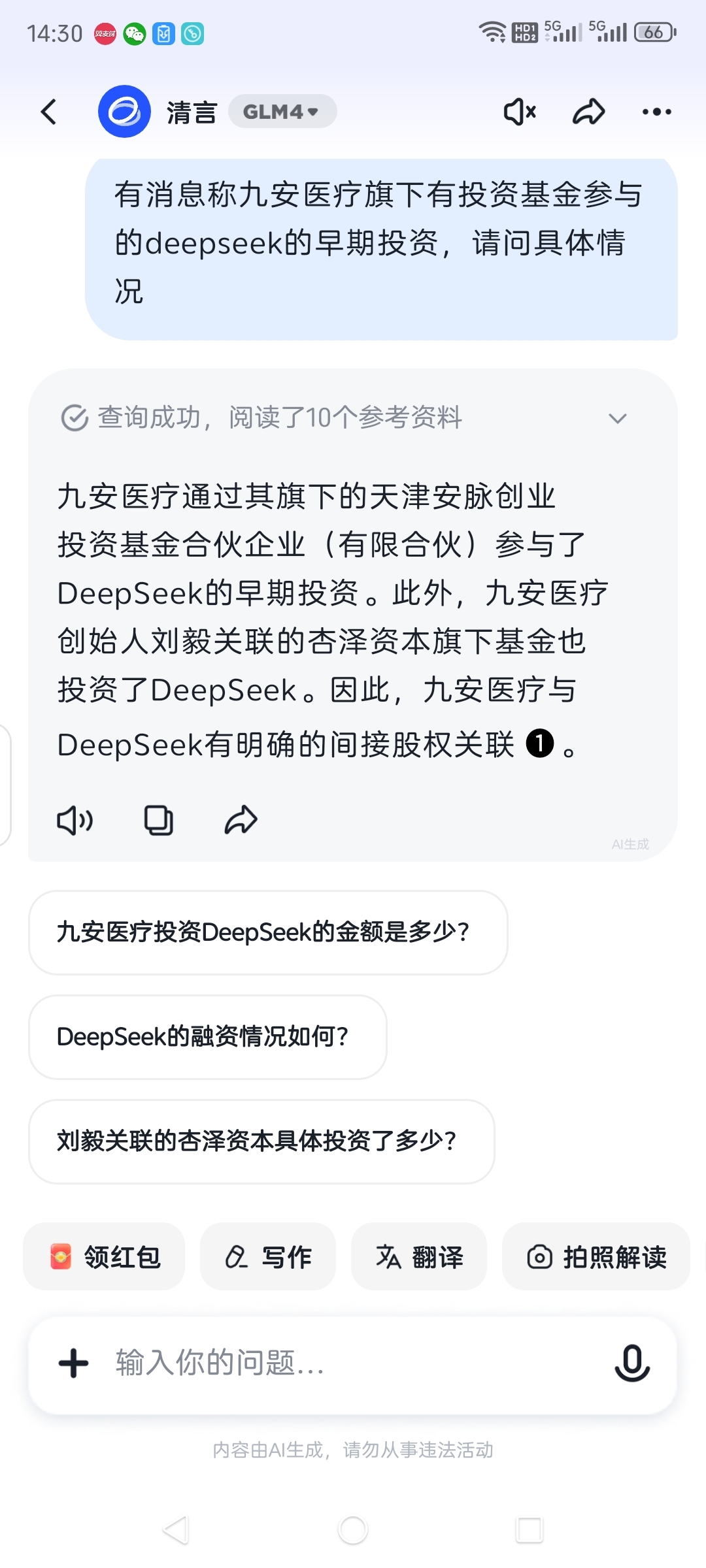 $九安医疗(SZ002432)$ 问了智谱清言、kimi、deepseek等关于九安医疗有没有投资deepseek的问题,结论如下