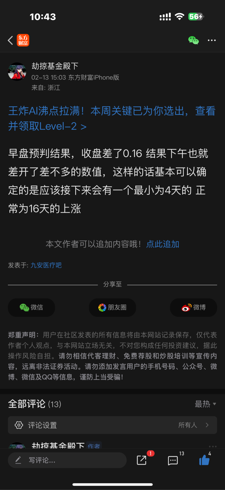 温馨提示: 1.根据《证券法》规定,禁止编造、传播虚假信息或者误导性信息,扰乱证券市场;2.用户在本社区发表的所有资料、言论等仅代表个人观点,与本网站立场无关,不对您构成任何投资建议。用户应基于自己的独立判断,自行决定证券投资并承担相应风险。《东方财富社区管理规定》