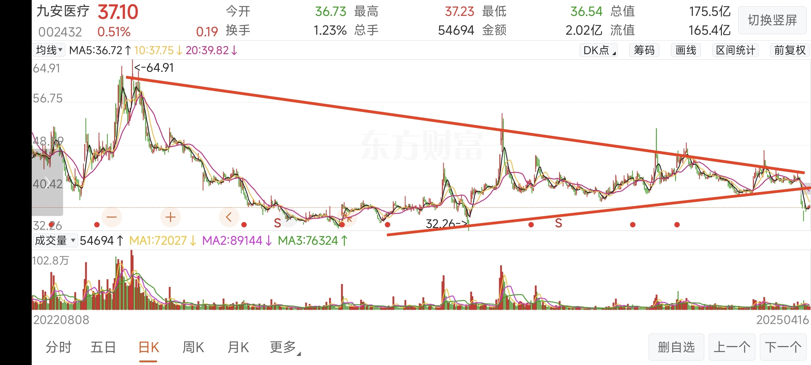 $九安医疗(SZ002432)$ 股价走势真难看,顶一次比一次低,底部慢慢抬高,然后在7日共振向下突破。大胆预测以下,本月和下月的顶部在40元附近