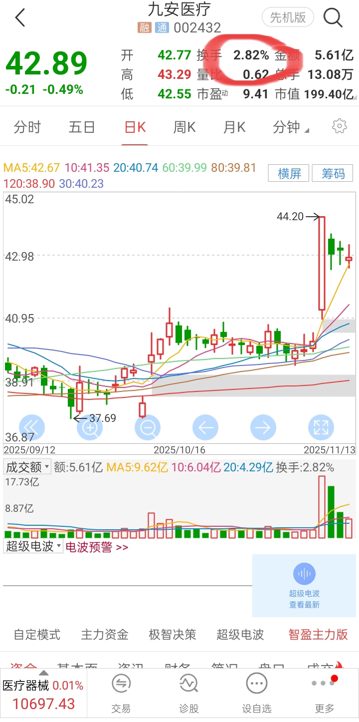 九安医疗6亿回购已经花光了,要开始下跌了,跌到40块钱以下。成交量开始迅速萎缩,