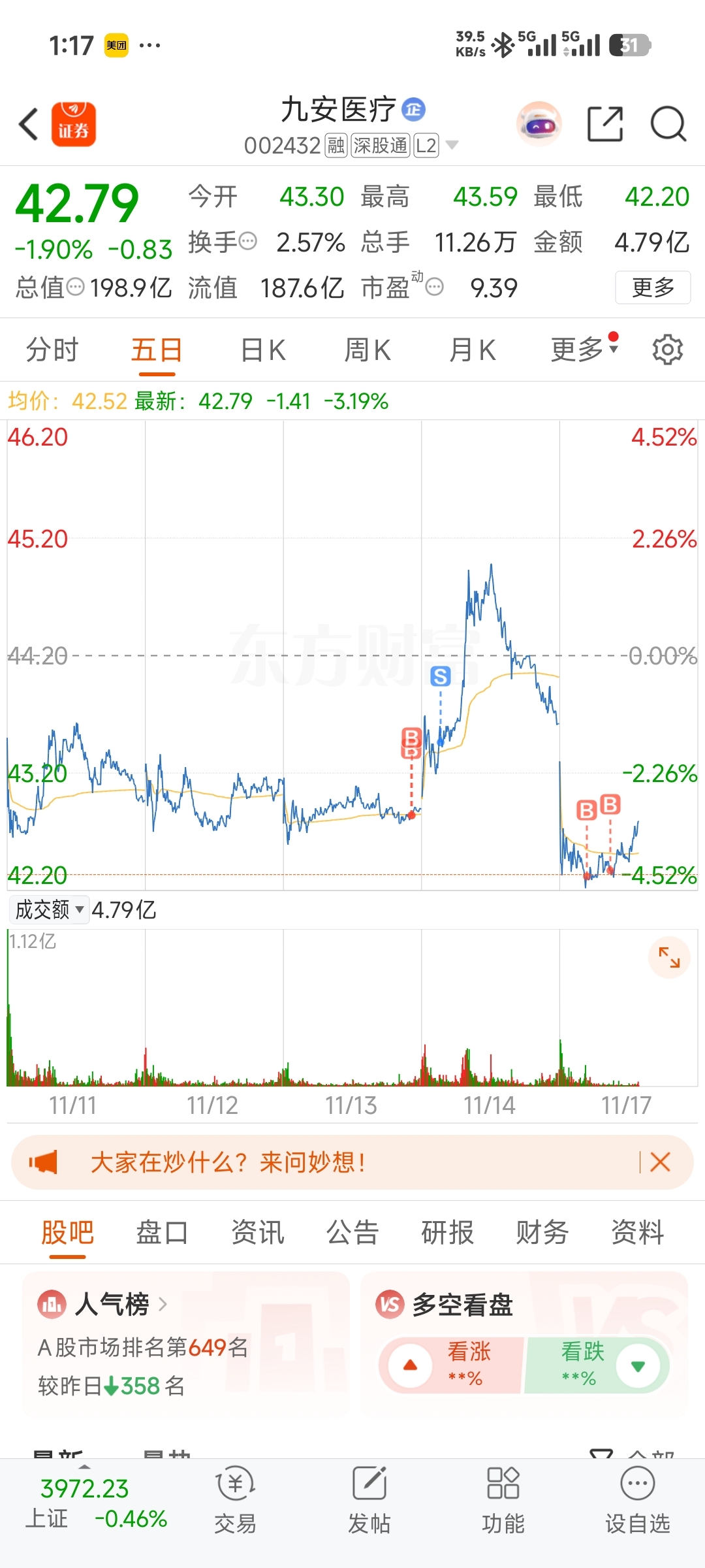 $九安医疗(SZ002432)$ 本来周五清仓哭死,现在我胡汉三又回来了