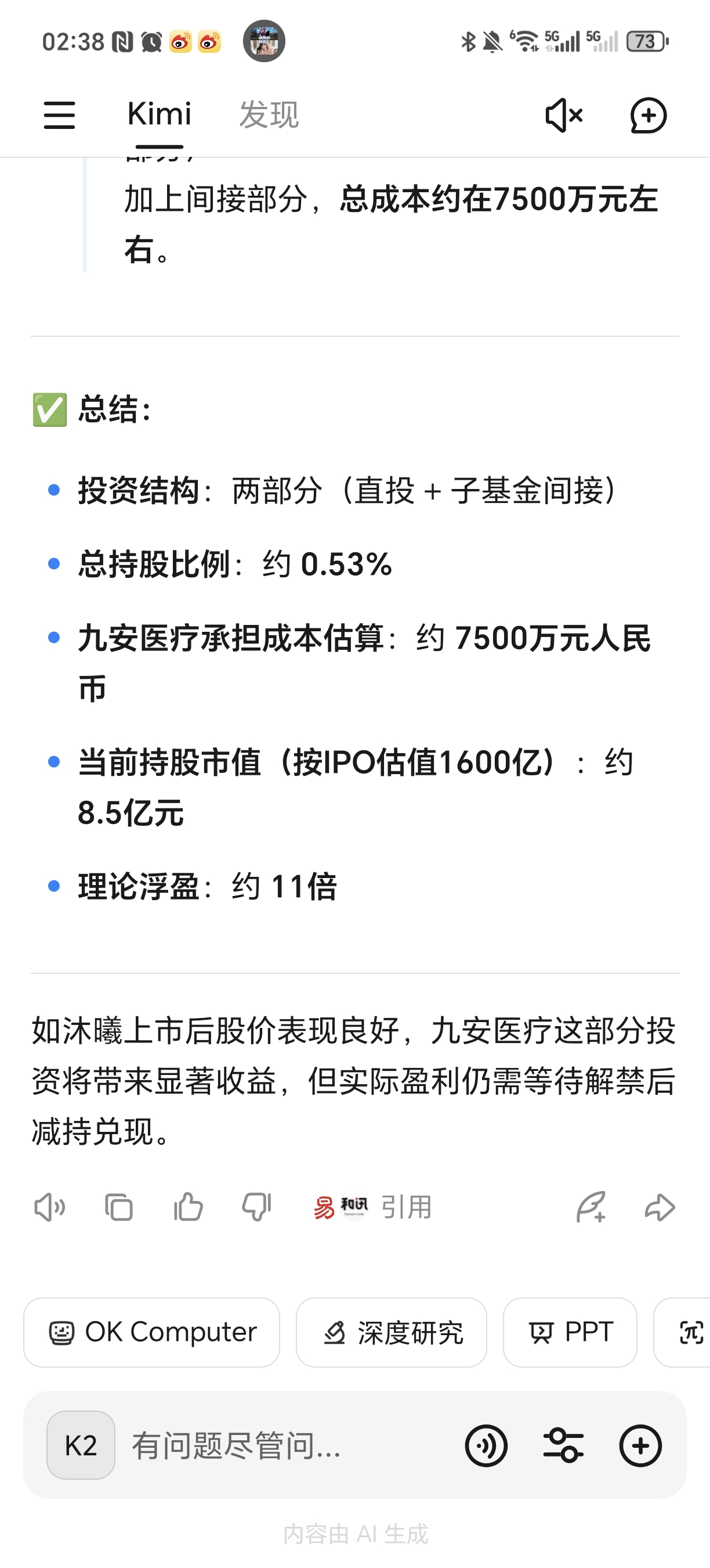 $九安医疗(SZ002432)$ 原始投资大概折算43.90/股,一年之后沐曦可以卖。你说沐曦明年这个时候值多少?这样的九安还投了不少啊!